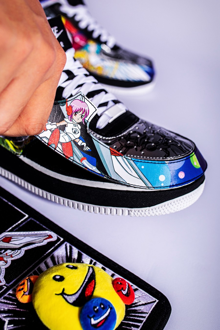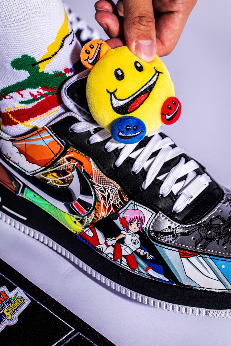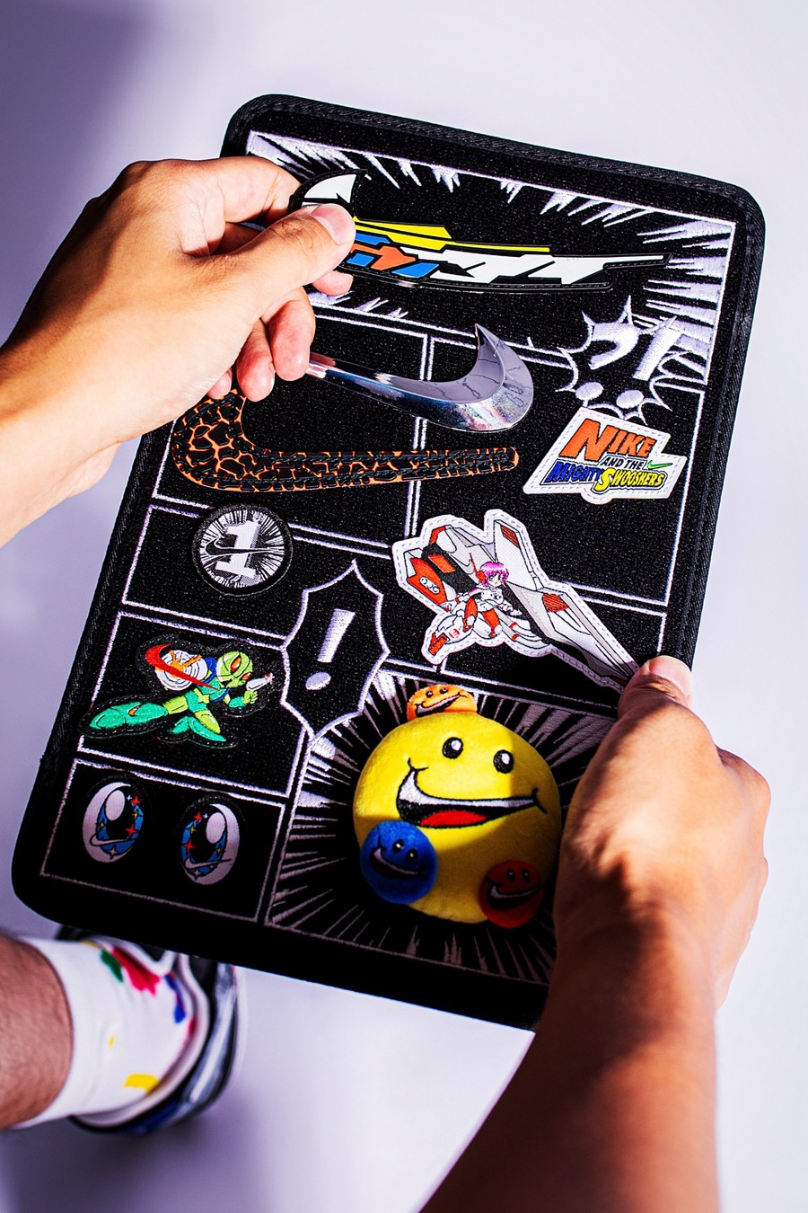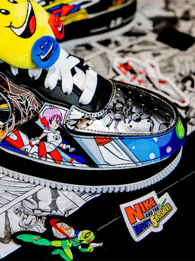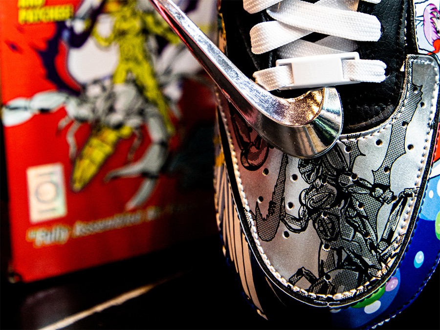 左脚鞋头的 NIKE SWOOSHMAN,则是 Nike 在 1997 年花费 12.5 万美元打造的自家超级英雄。