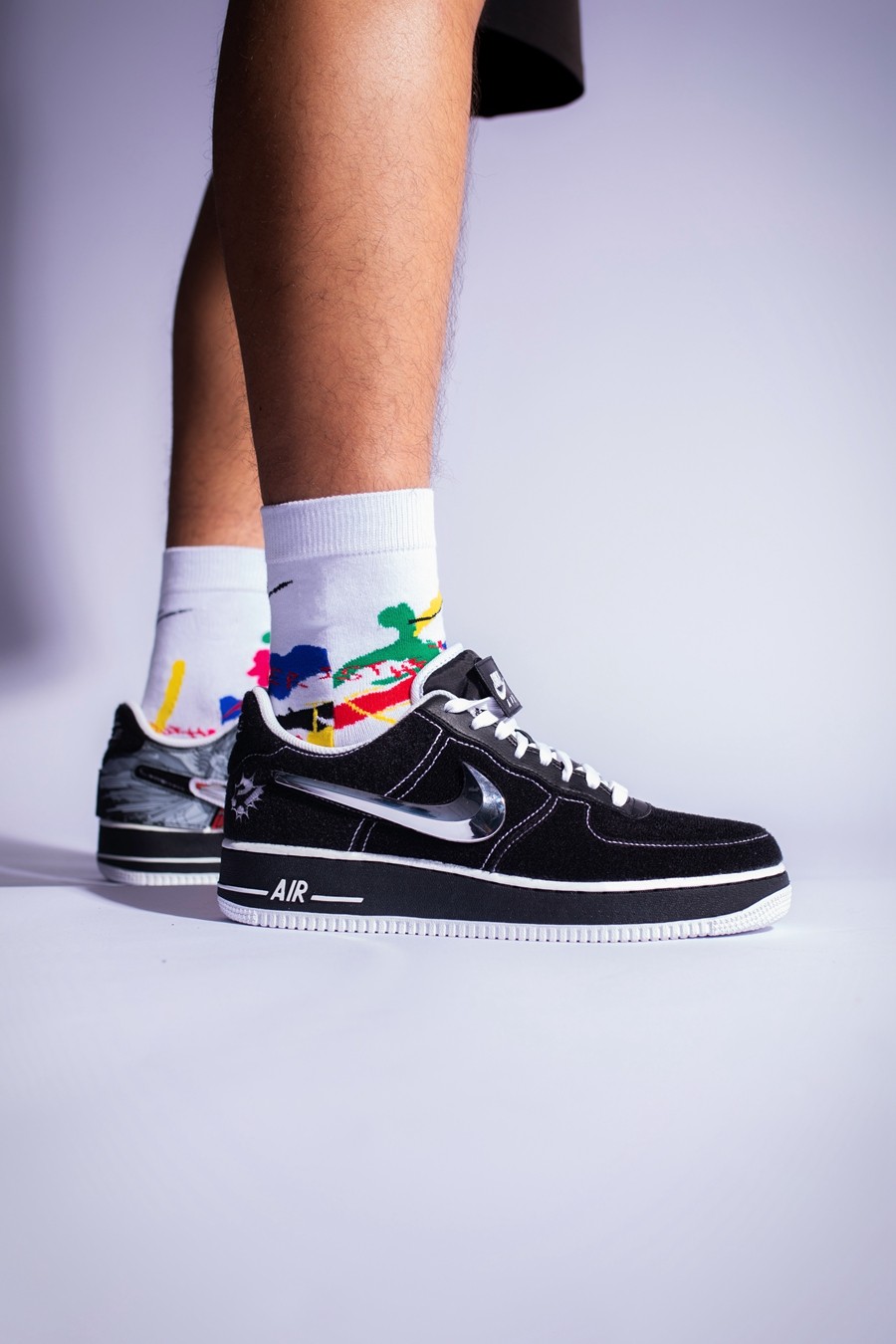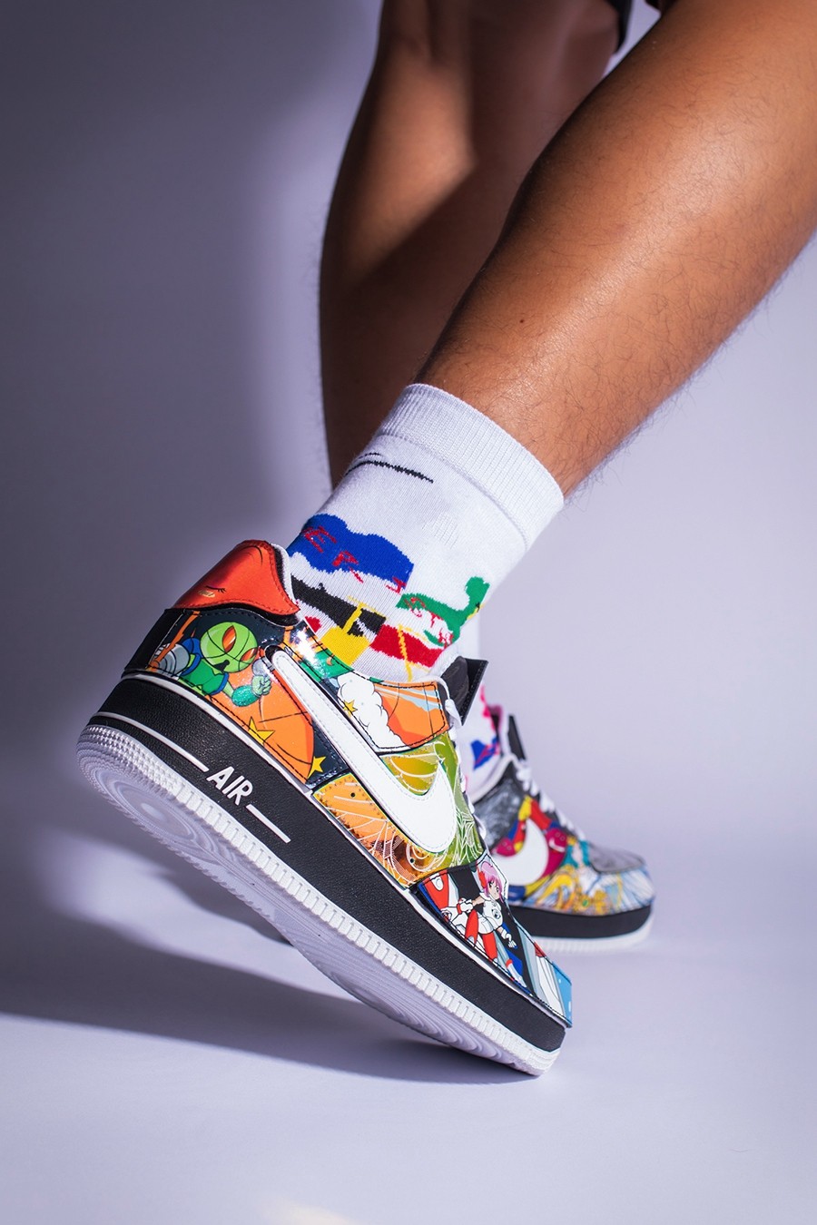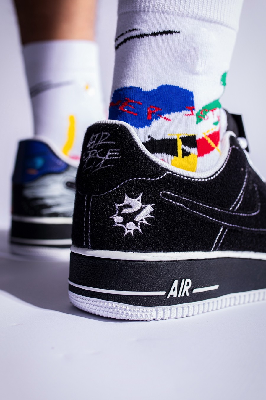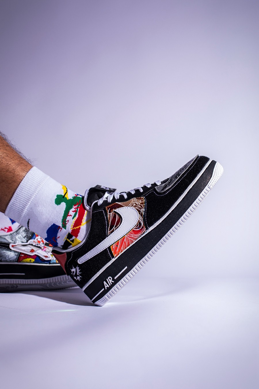 左脚鞋头的 NIKE SWOOSHMAN,则是 Nike 在 1997 年花费 12.5 万美元打造的自家超级英雄。