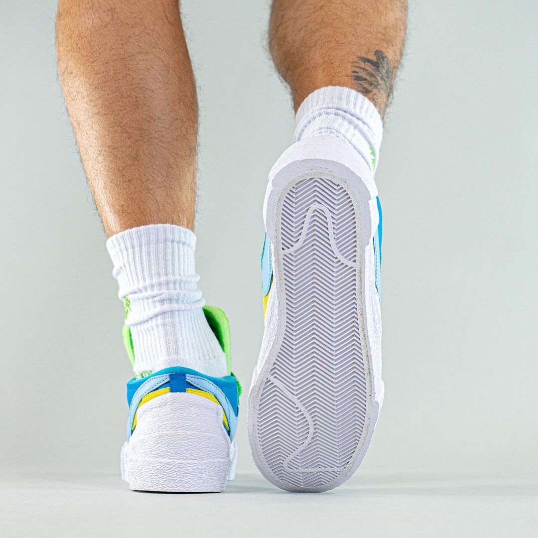此前在 sacai x KAWS 联名服饰型录中现身的联名球鞋 sacai x KAWS x Nike Blazer Low,近期迎来一组全新的实物上脚图片,似乎预示着发售日期临近。