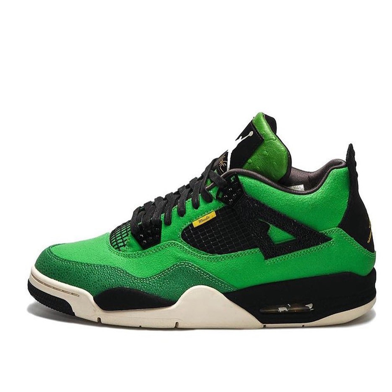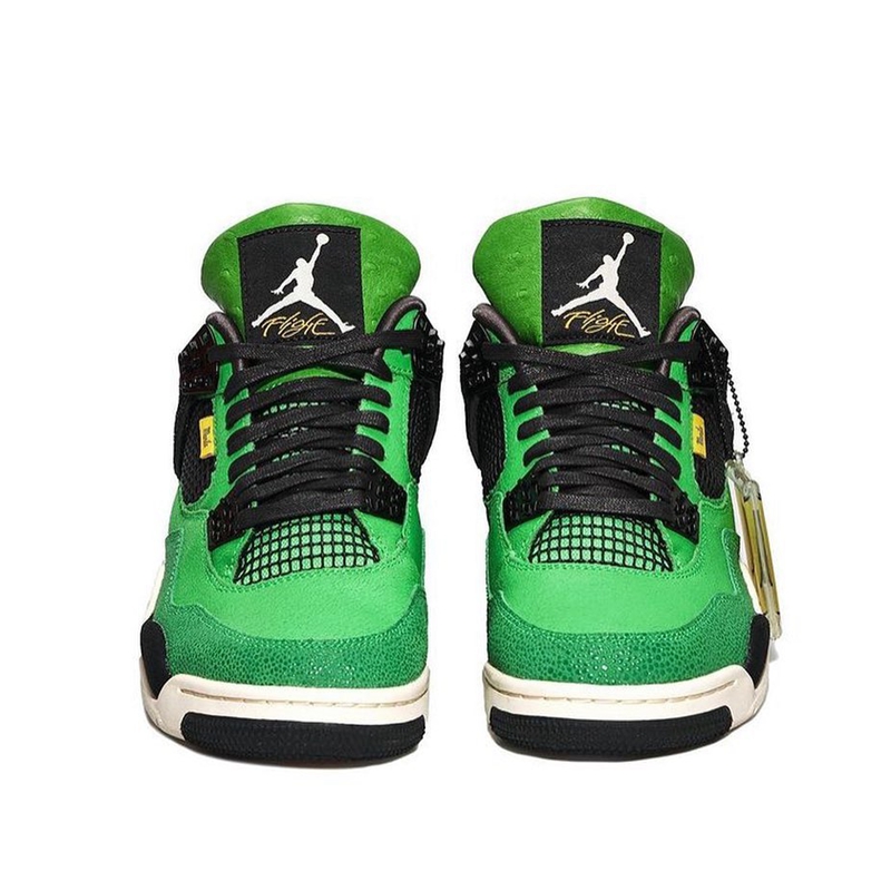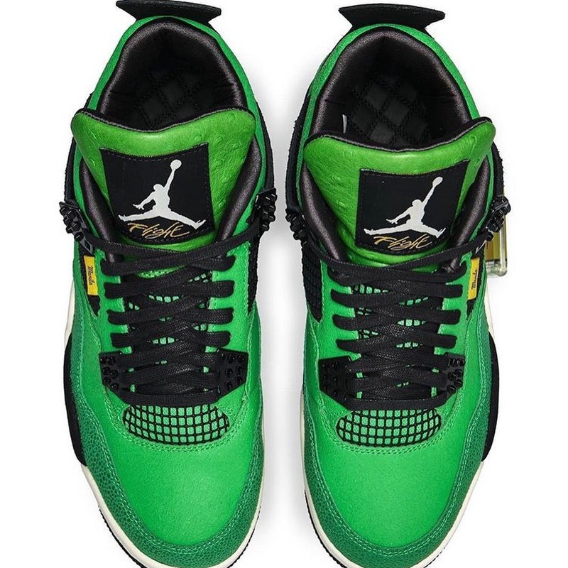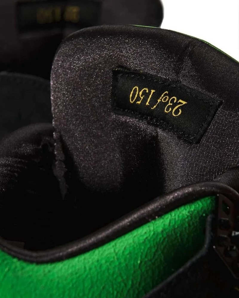 该鞋款也是为了庆祝 Jordan 在马尼拉开设的首家店铺而打造,整双鞋采用通体绿色打造,鞋面由珍珠鱼皮和翻毛皮拼接制成,绿色的鞋舌则是鸵鸟皮纹理。