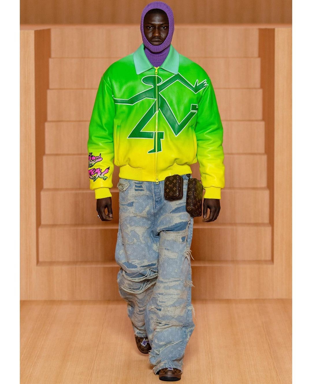 除此之外还可以看出,为了搭配这双「神物」Travis Scott 选择了一件绿色长袖外套和一条肥大的水洗牛仔裤,据小编得知这身搭配都是 Louis Vuitton 还未发售的新品,呈现出复古又吸睛的视觉效果。