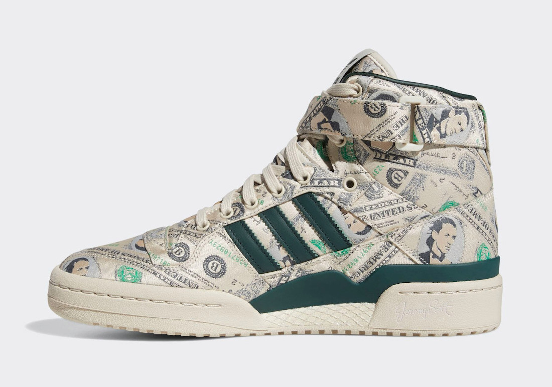 设计依旧以经典鞋款 Forum Hi 为原型,整双鞋以乳白色为背景,丝绸质感的鞋面上满印有类似美金的图案,美式复古街头的感觉格外浓郁。
