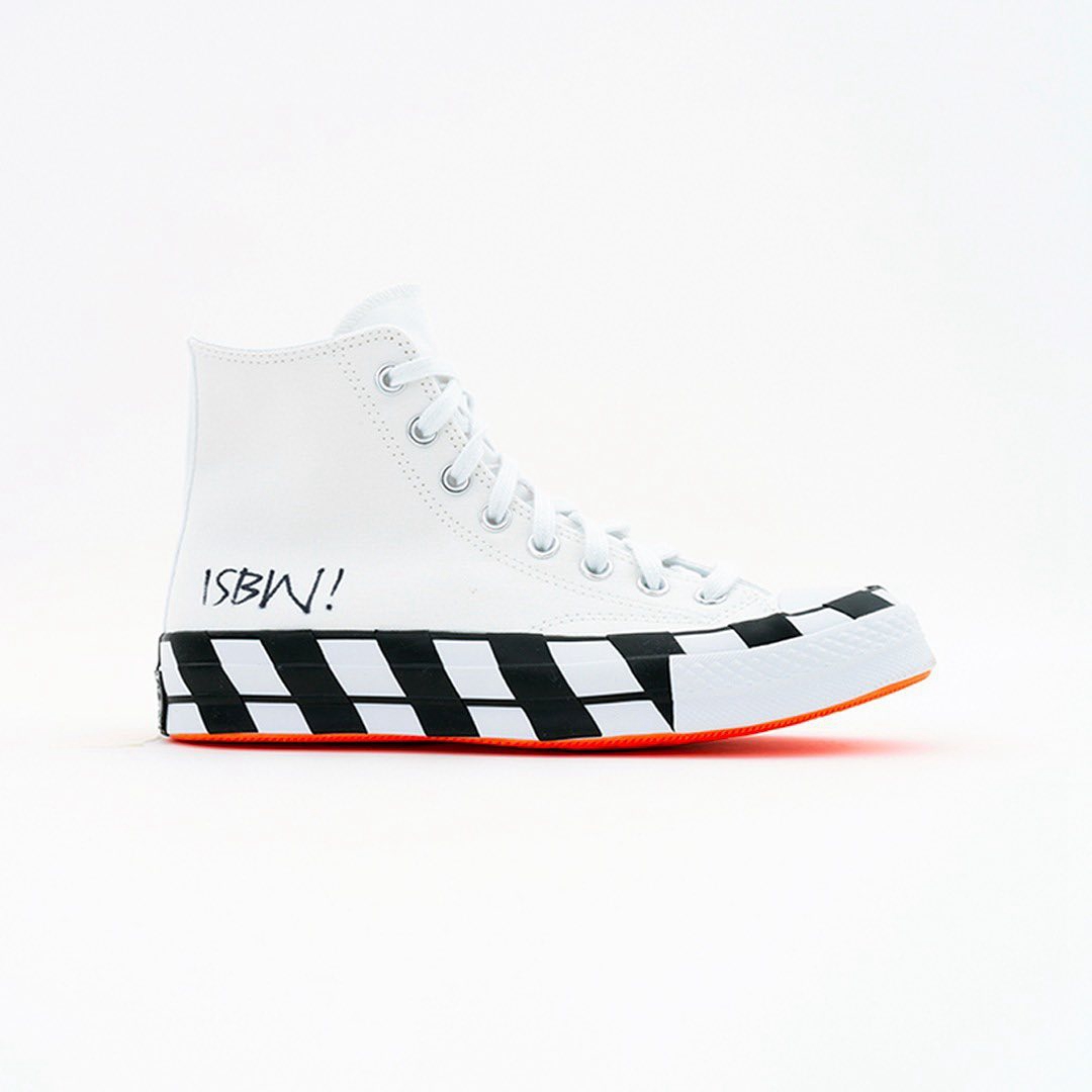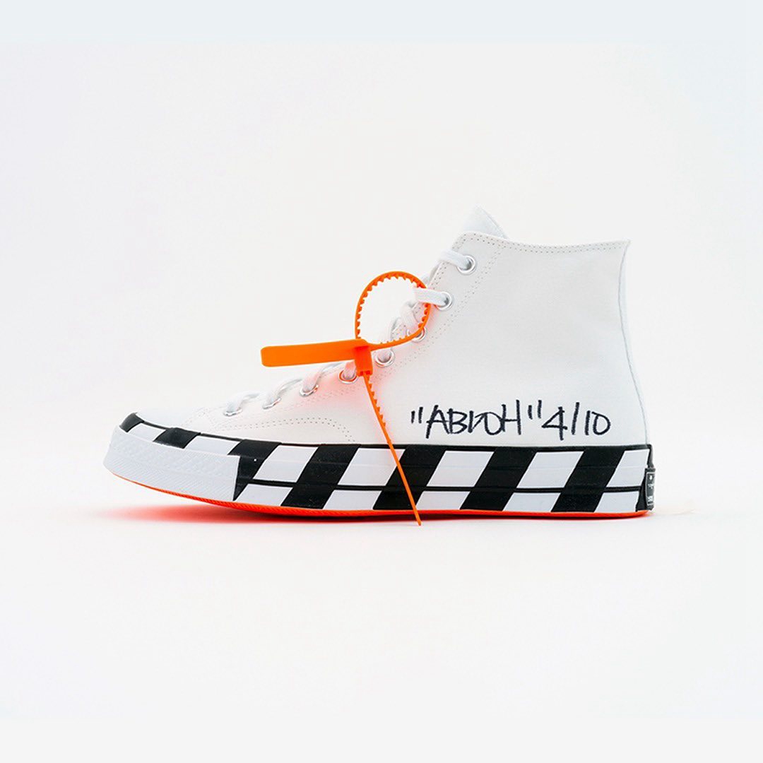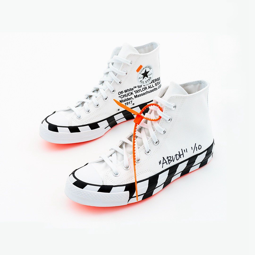 此次选择了 OFF-WHITE x Converse 2.0 为蓝本,十双鞋分别在右脚鞋身上写有 “ABLOH 1-10” 的样式,彰显出每双鞋的特别。