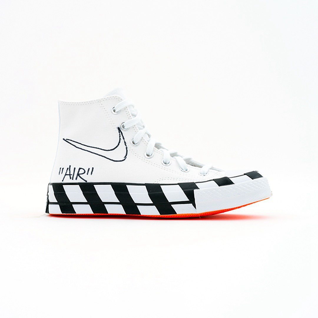 左脚上的图案则更加丰富,最值得一提的莫过于 Swoosh Logo 和 AIR 字样,这难道就是 Converse x Nike x OFF-WHITE 吗?
