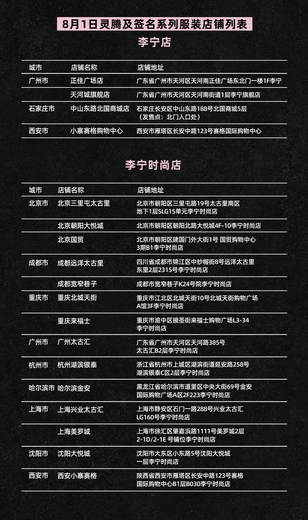 线下指定店铺也将在明早 10 点开启抽签发售,店铺列表在文末,详细规则可以前往李宁公众号了解。