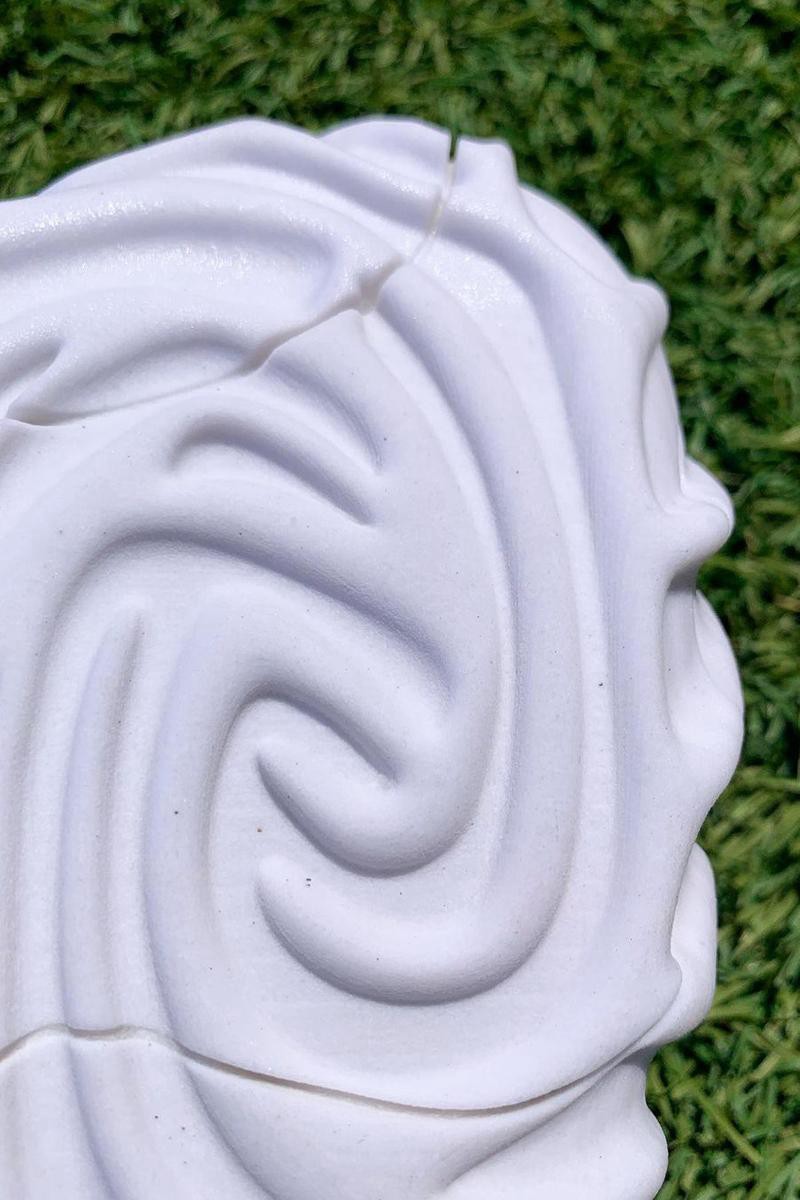 脊骨状纹理的纯白色鞋面由泡棉打造,呈现满满的生物质感,前脚掌处椭圆形镂空用来提高鞋款透气性。