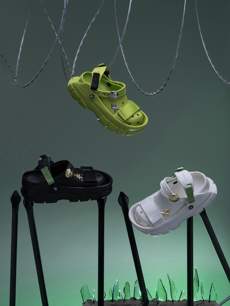 Crocs 与时装设计师上官喆的限量联名鞋款 SANKUANZ x Crocs 以经典克骆格为基础,SANKUANZ 将品牌经典设计理念与设计元素注入其中,通过套嵌式设计未来感十足,并在鞋面加上了质感满满的标志性可拆卸配件。