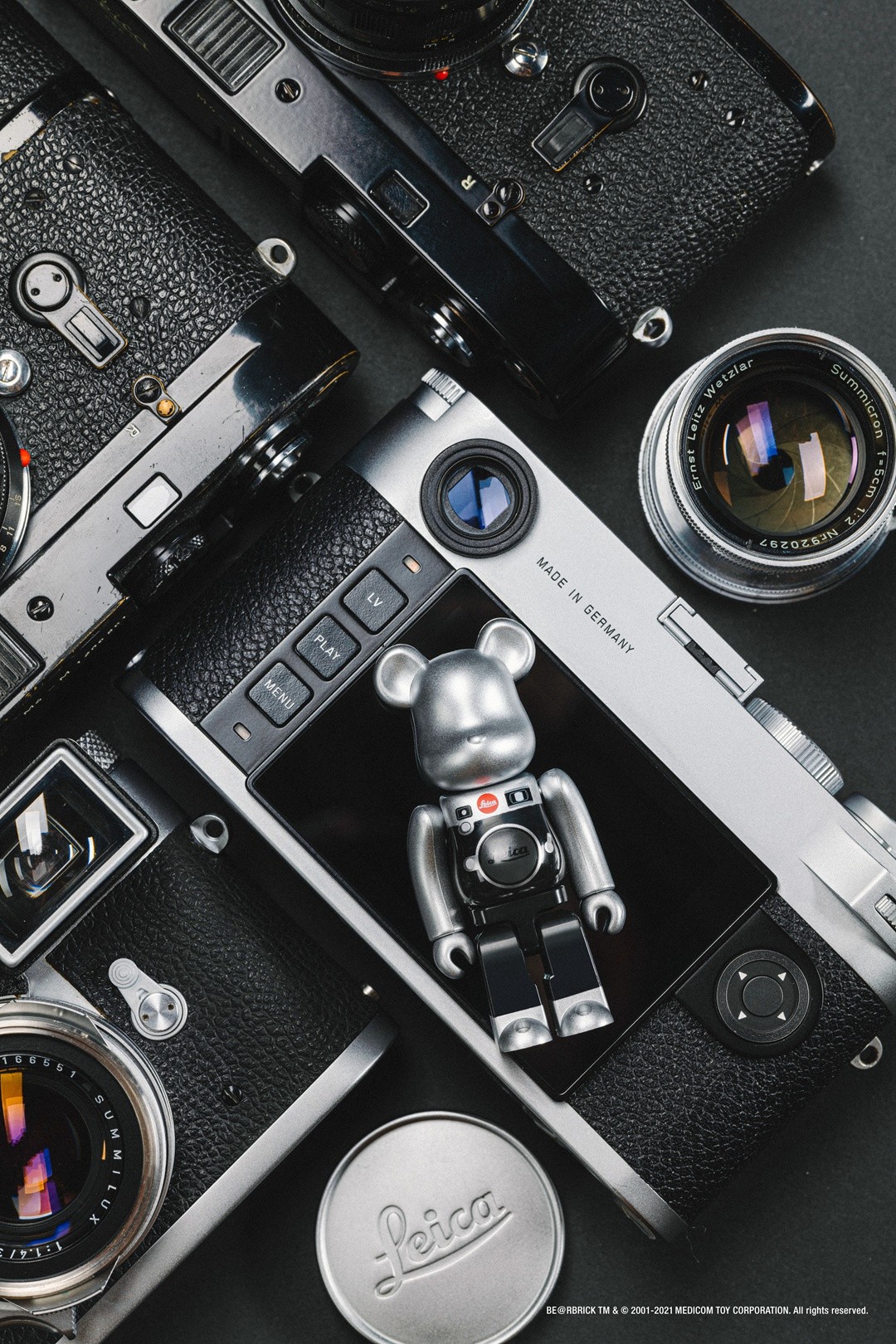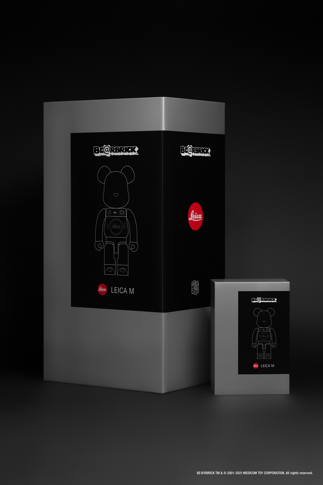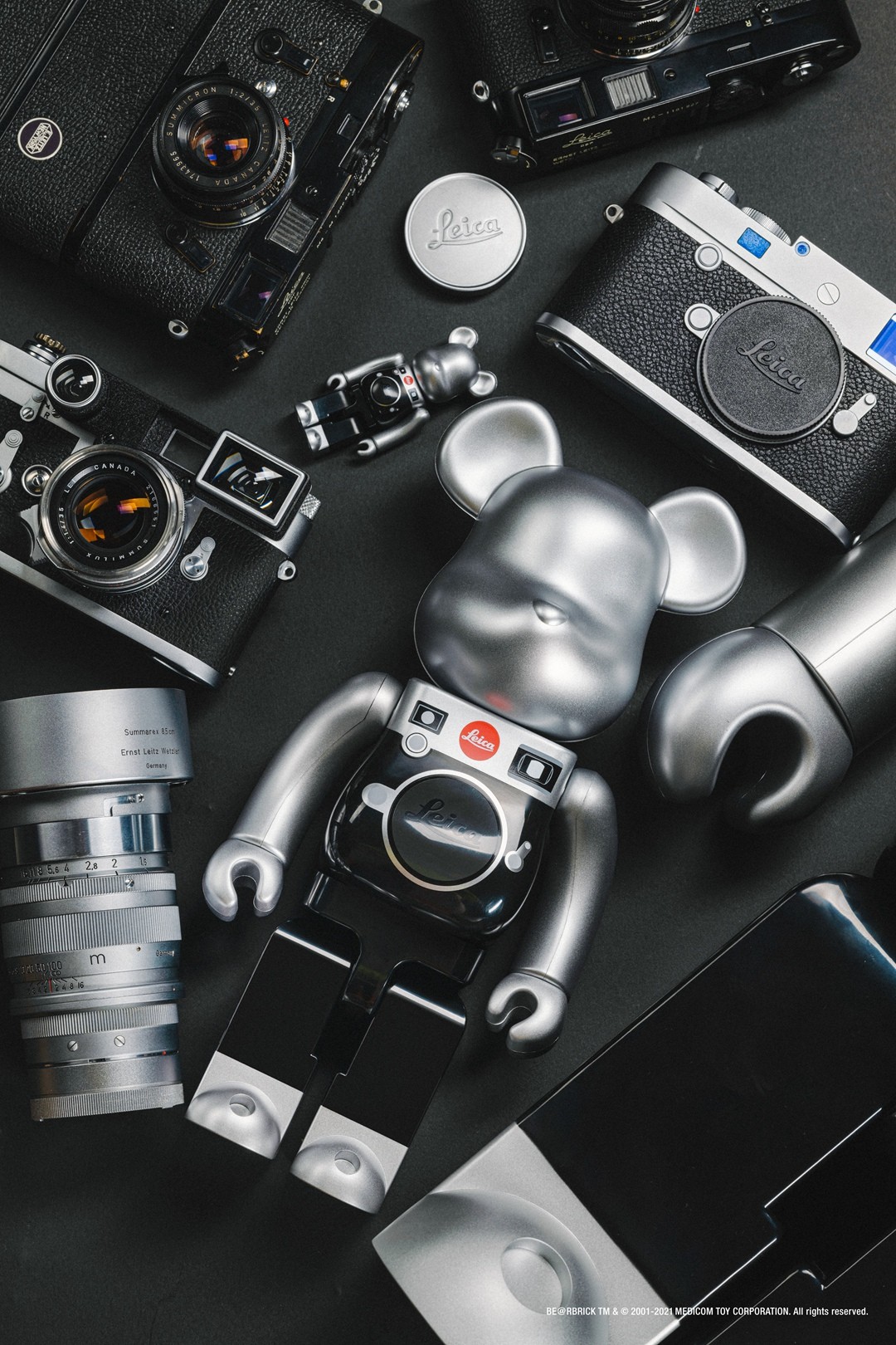 此次的全新联名 BE@RBRICK 找到了徕卡相机公司,并以徕卡最为经典的 M 系统相机为设计灵感,黑银配色的造型与徕卡相机的外貌相互呼应,将经典与潮流结合的毫无违和感。