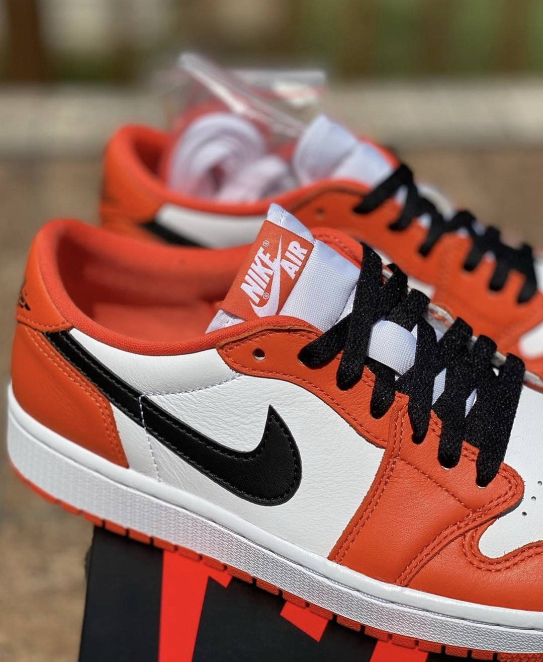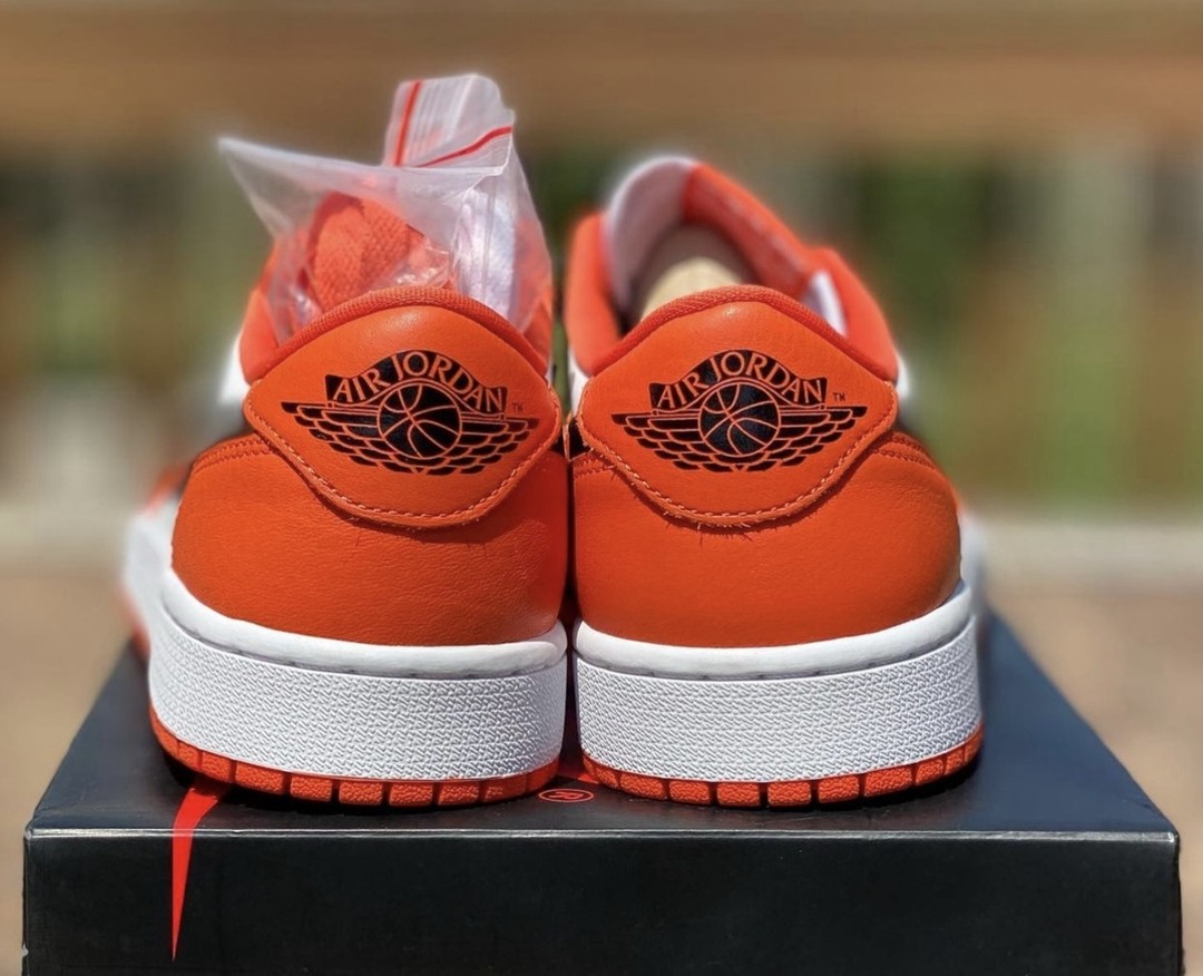 鞋身以白色为主调,搭配上橙色框架,呈现出 OG 气质十足的扣碎造型。