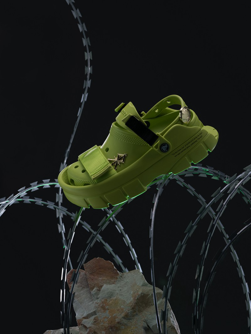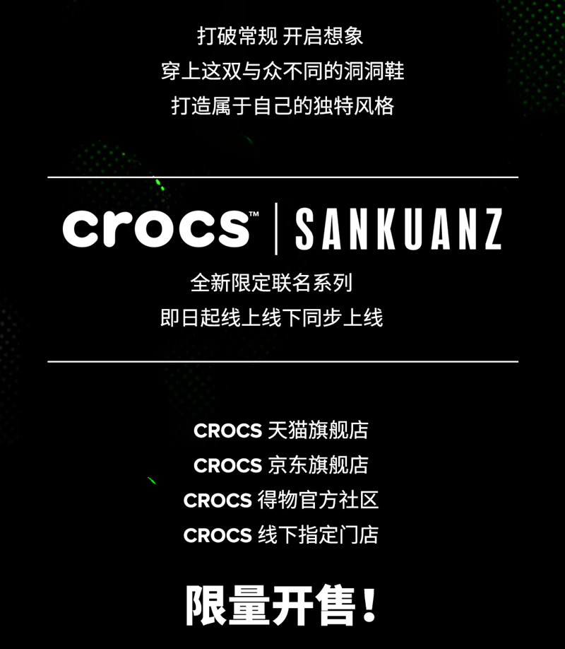 除绿色外还有适合日常搭配的经典黑、经典白两款配色,每一款与鞋体搭配的智必星(Jibbitz™)也使用品牌符号中的 SANKUANZ Crocs 和 DROWN 52 的海龙标志。