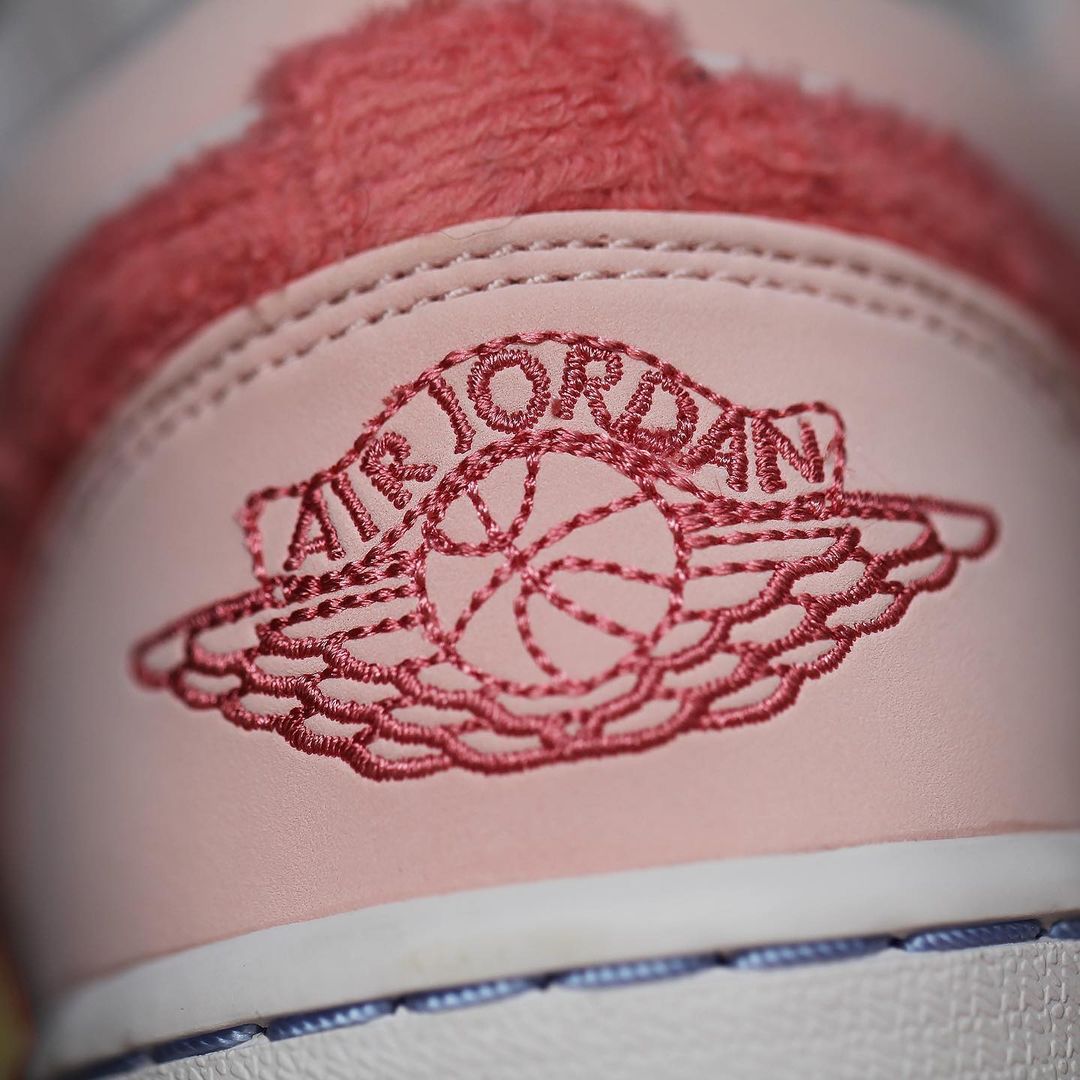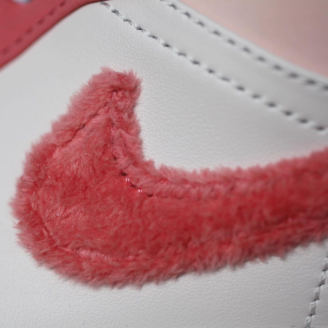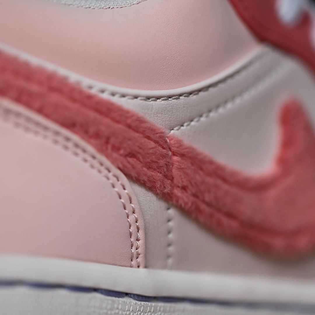 粉色款整体配色方案与蓝色款无异,鞋侧的 Swoosh Logo 采用毛巾材质呈现,呈现出独特的质感。