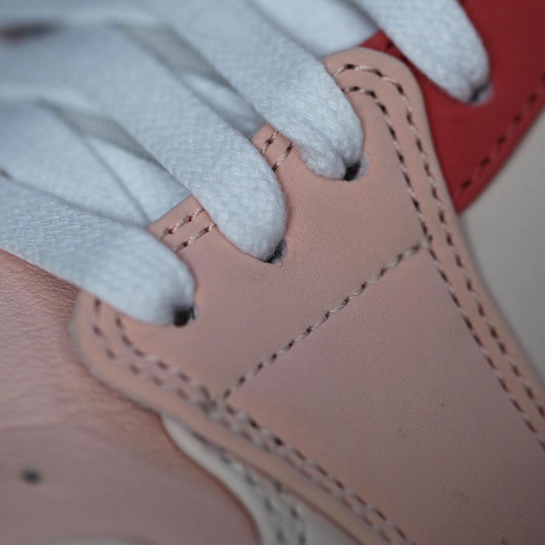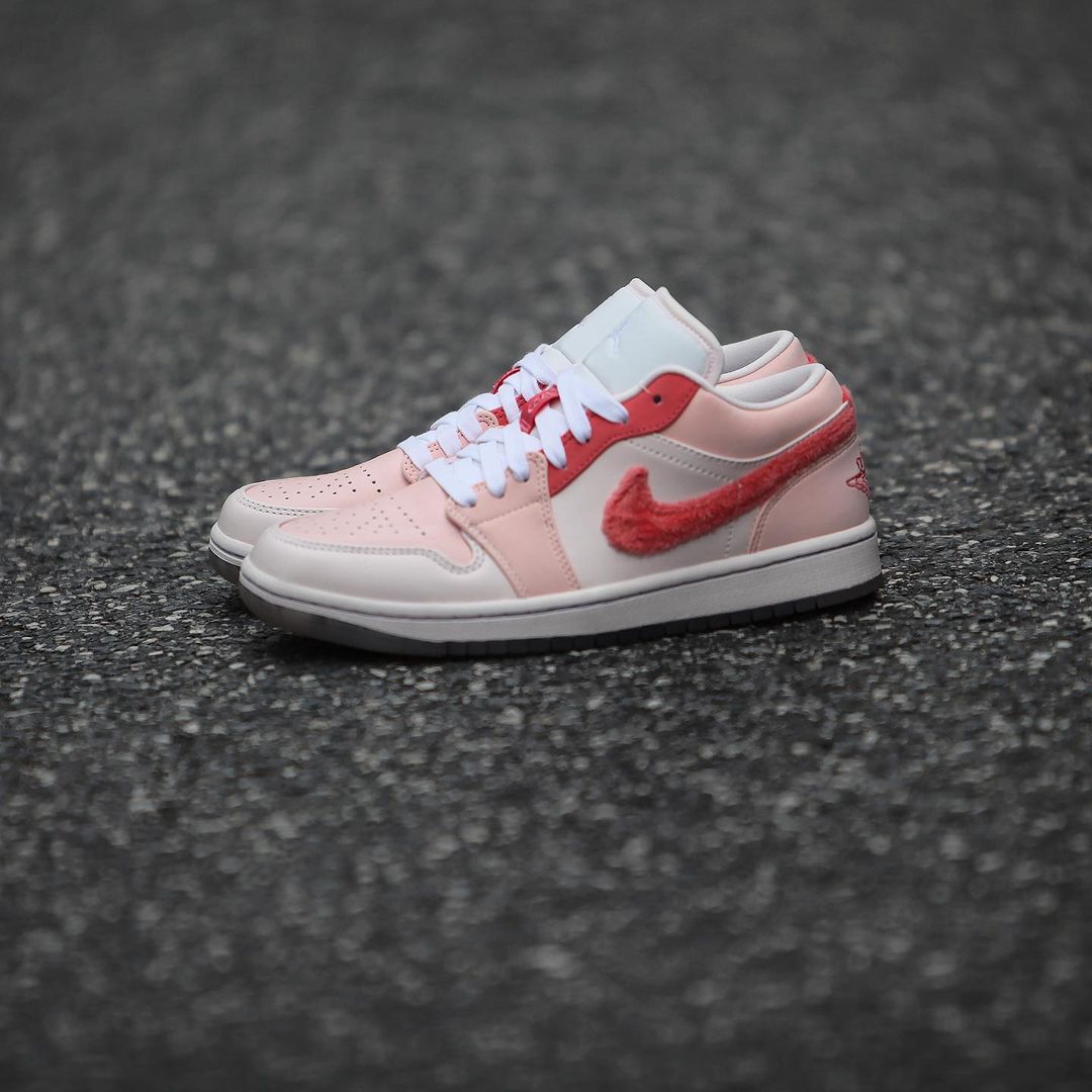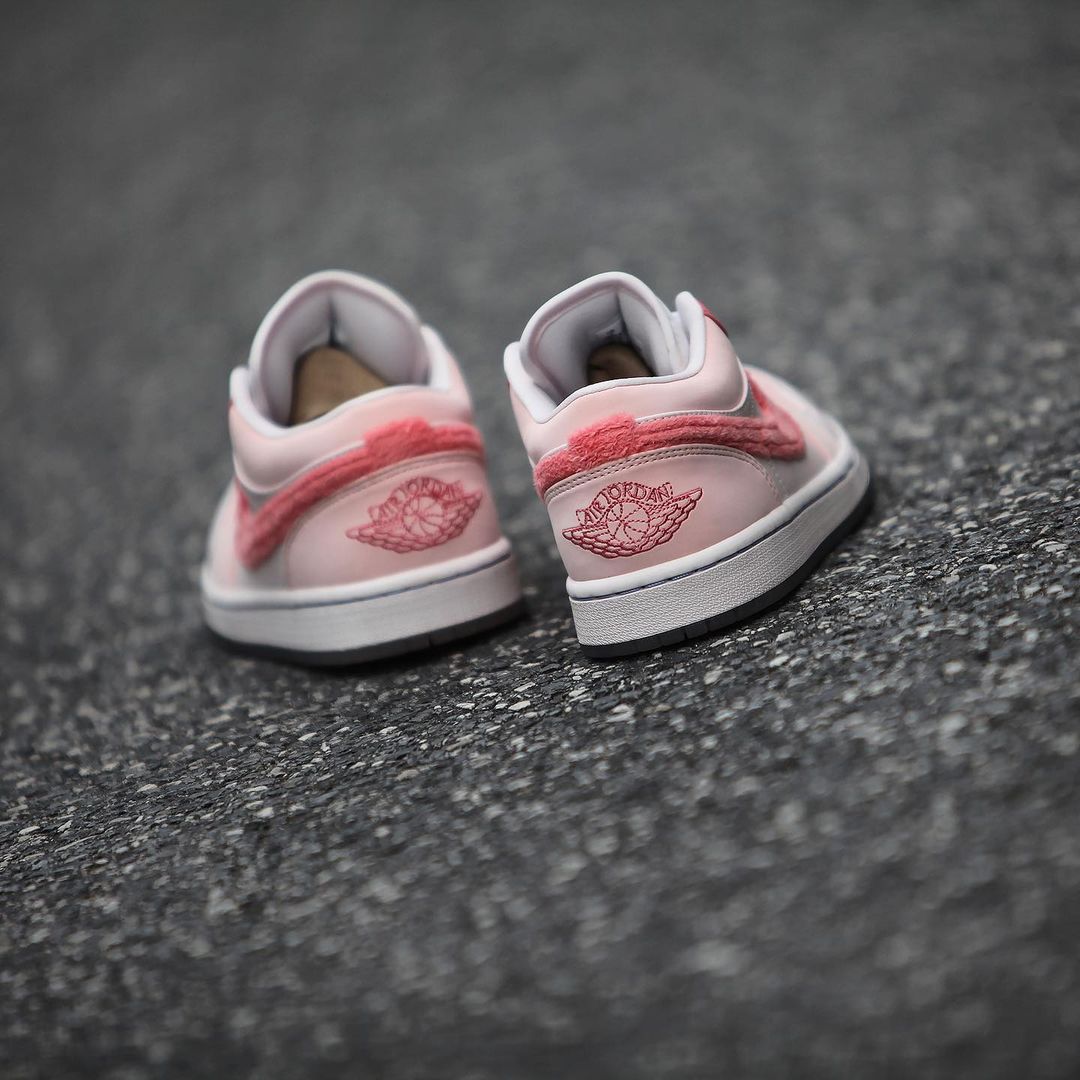 粉色款整体配色方案与蓝色款无异,鞋侧的 Swoosh Logo 采用毛巾材质呈现,呈现出独特的质感。