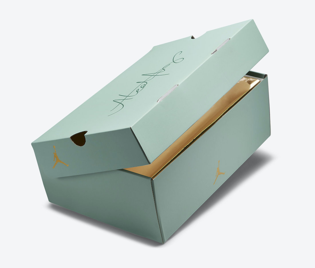全新设计的薄荷绿鞋盒与金色衬纸,呼应鞋身翡翠元素,并且点缀有 Aleali May 签名,完善了整双鞋设计。