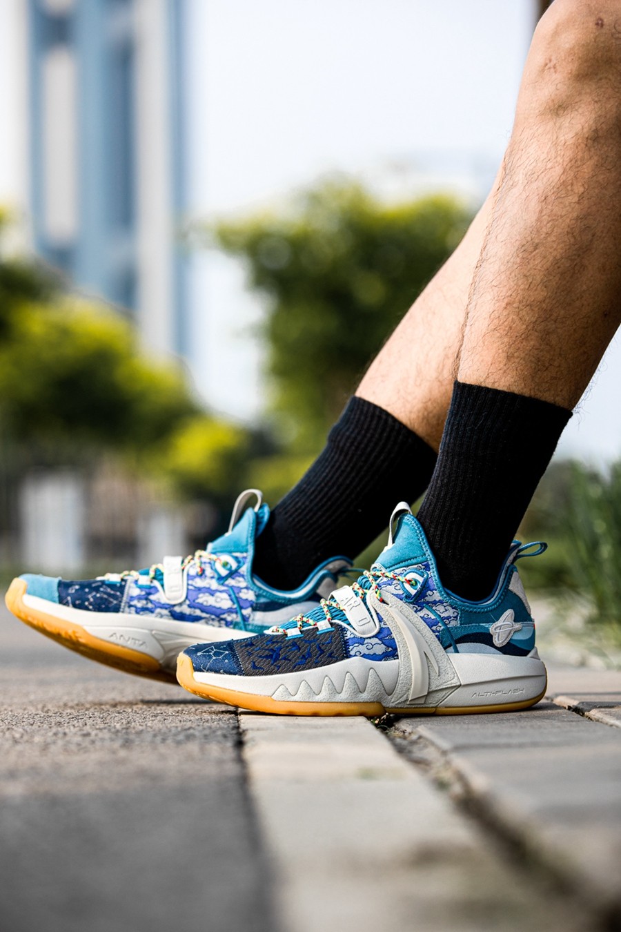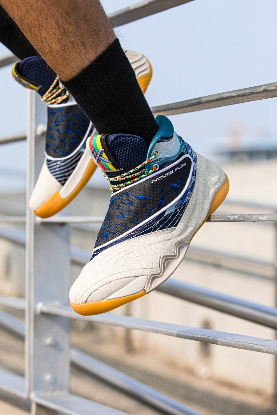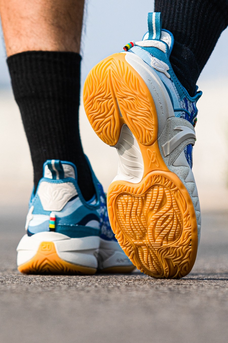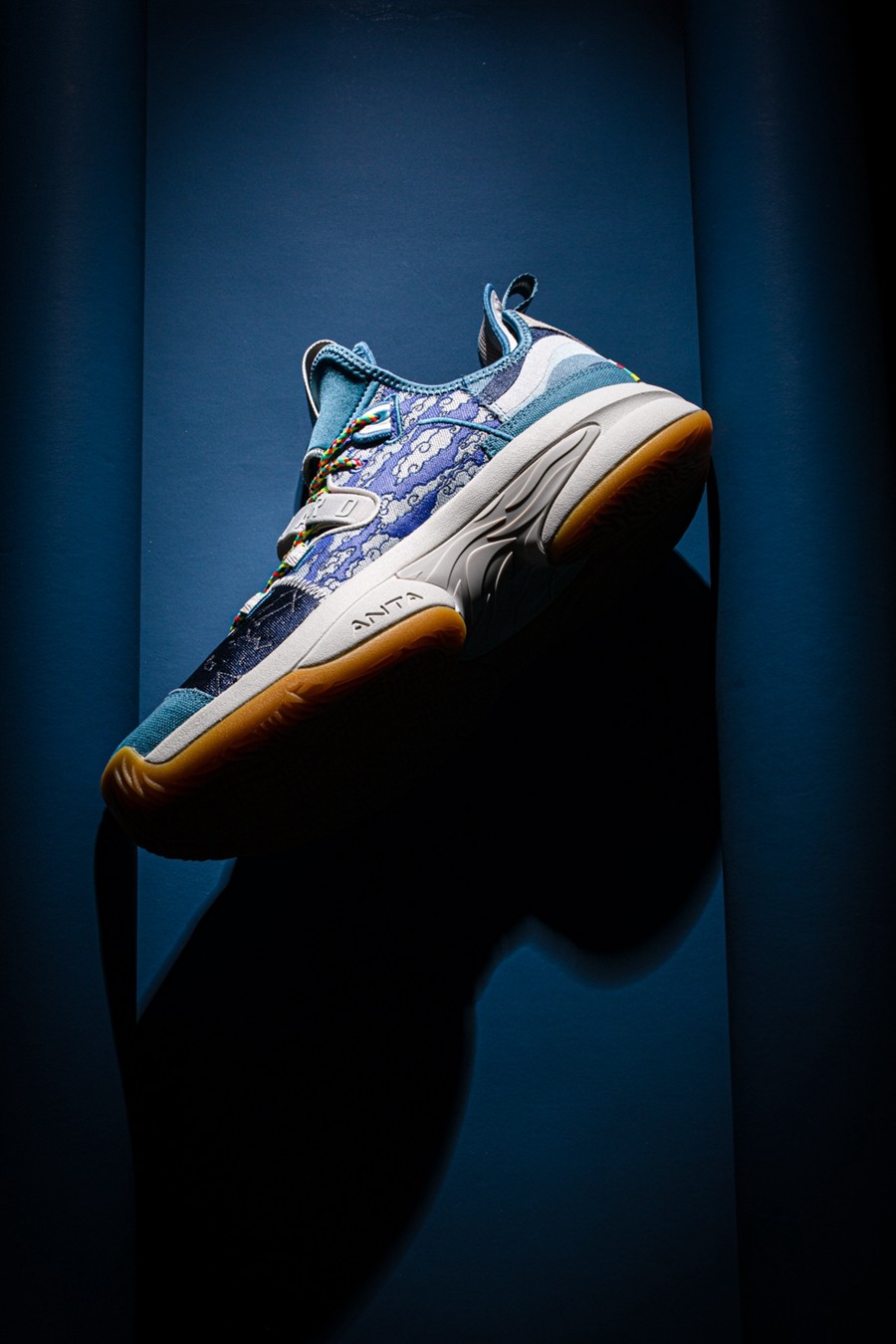 鞋身后侧则通过水蓝色渐变色调与祥云图案,传递「七夕储水」、「七夕观云」等各地民俗,寓意健康平安,吉祥如意。