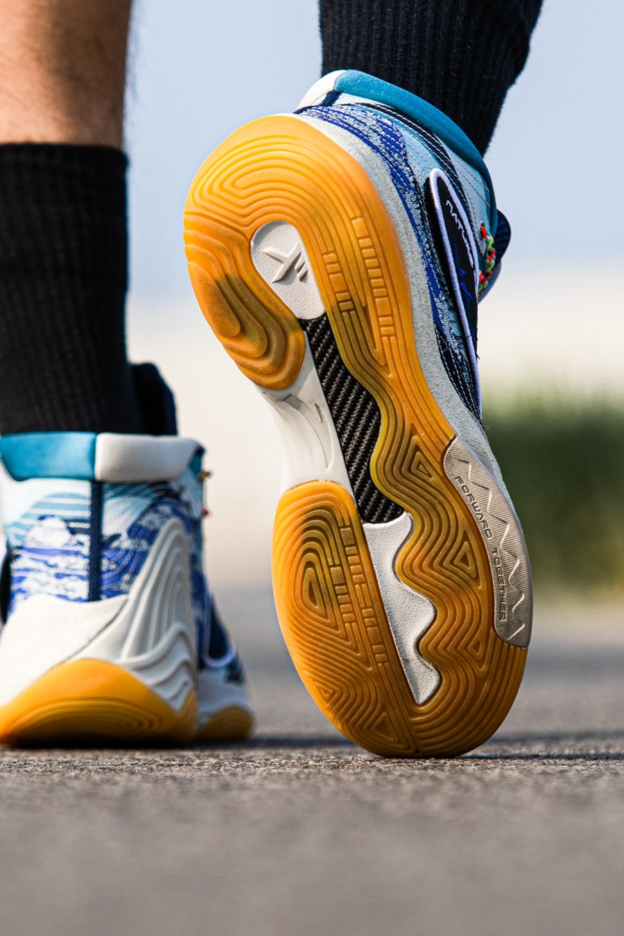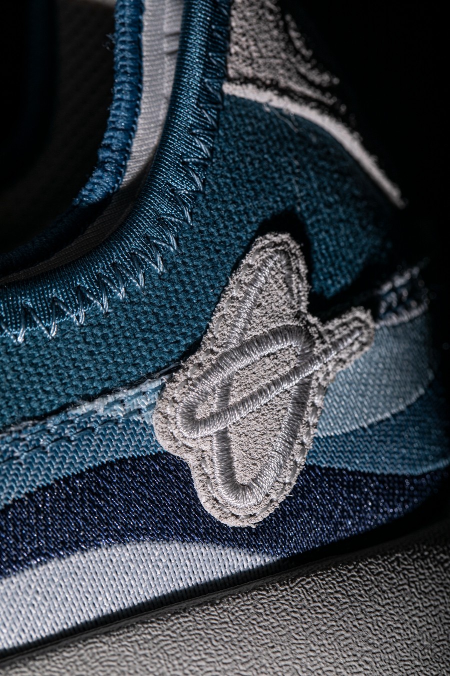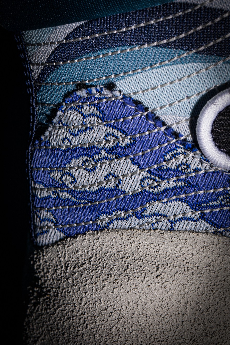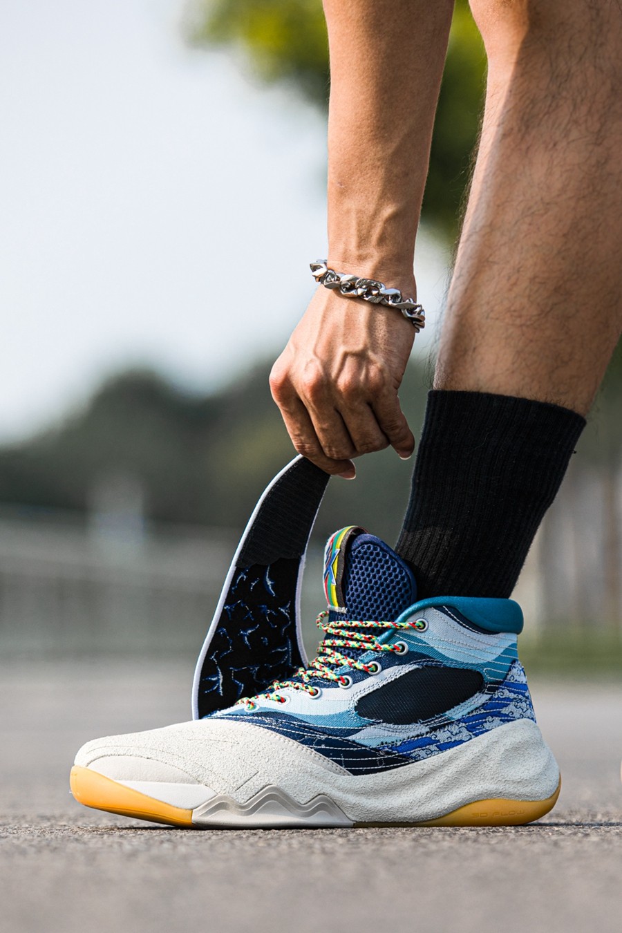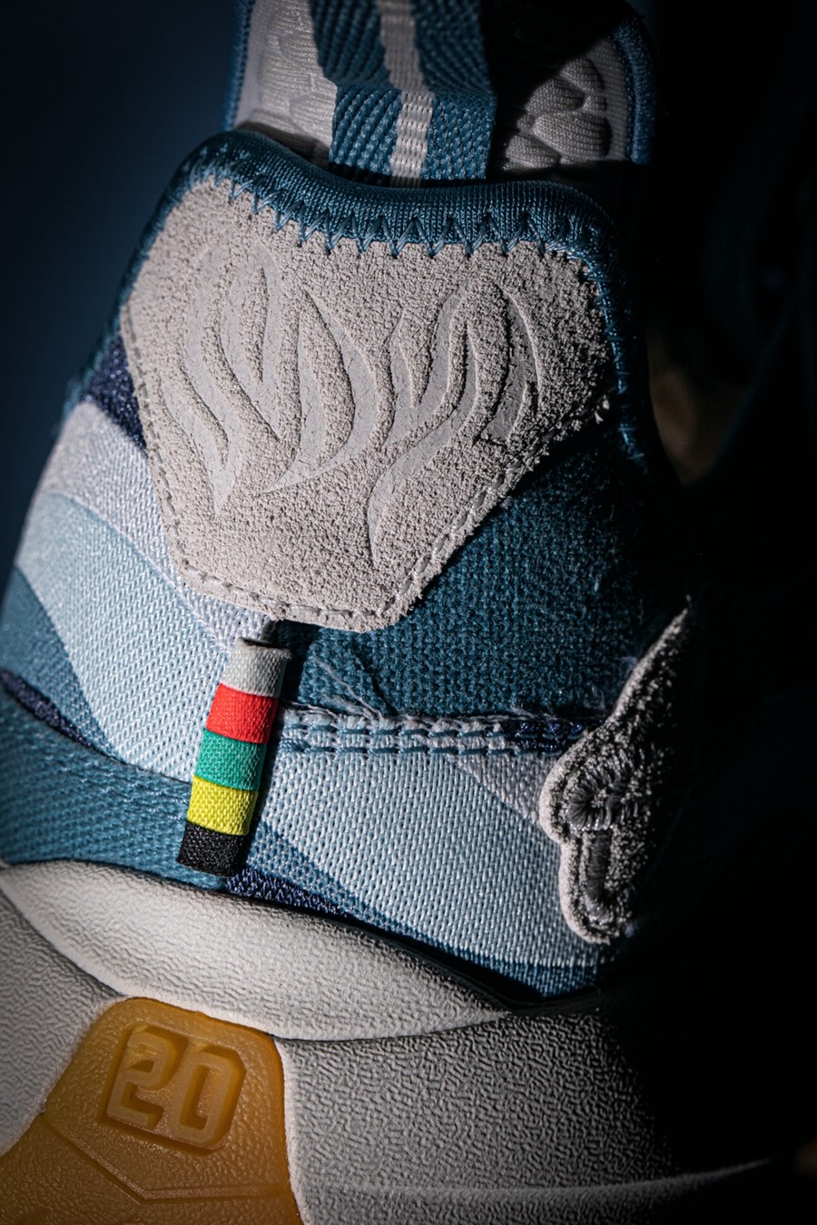 鞋身后侧则通过水蓝色渐变色调与祥云图案,传递「七夕储水」、「七夕观云」等各地民俗,寓意健康平安,吉祥如意。