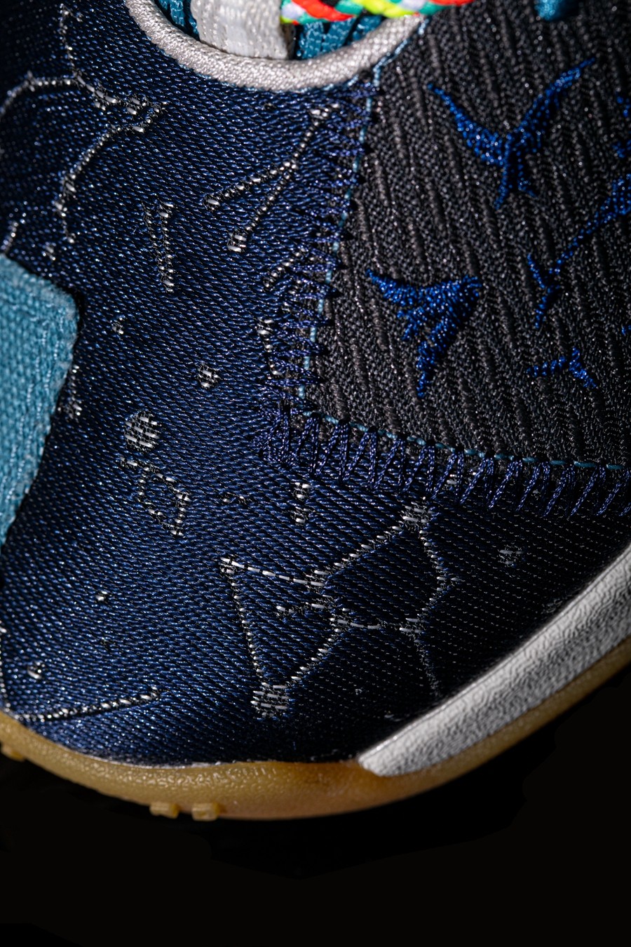 鞋舌与鞋带的五彩绳设计,源于七夕习俗中流传时间最久、范围最广的「穿针乞巧」,俗称月下穿针。