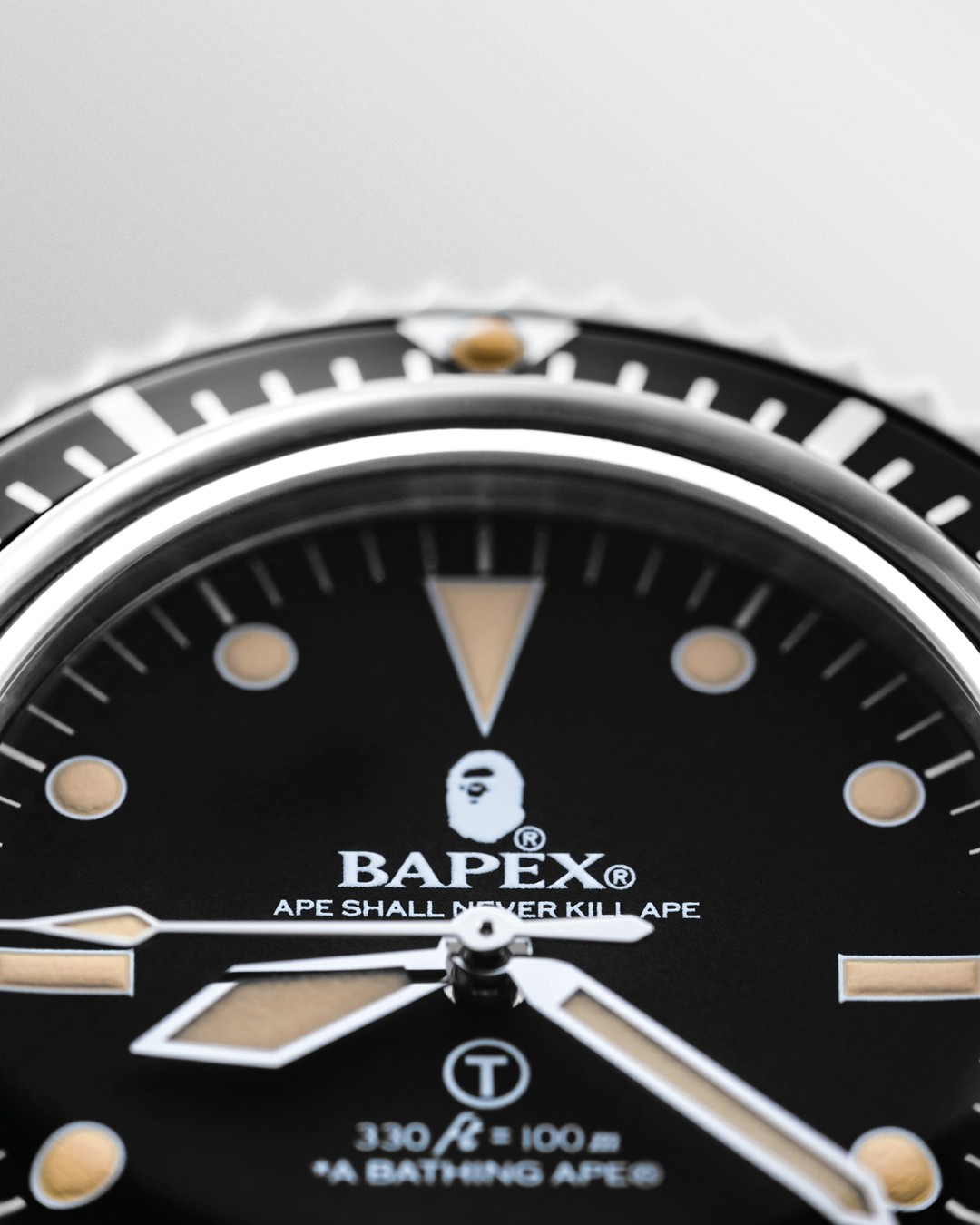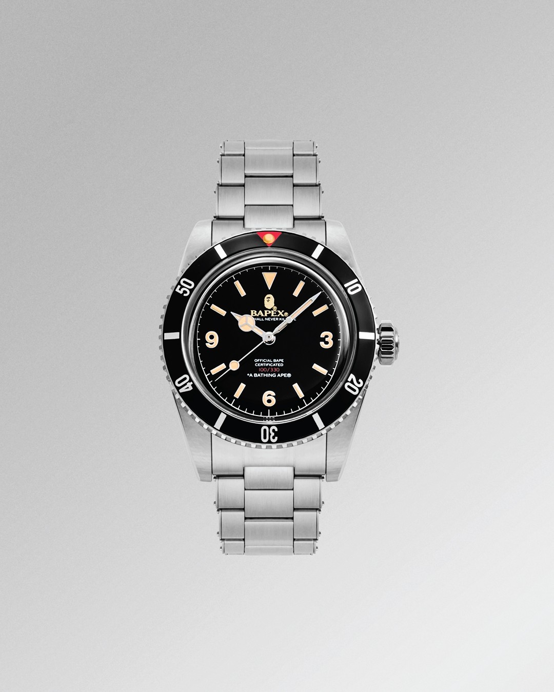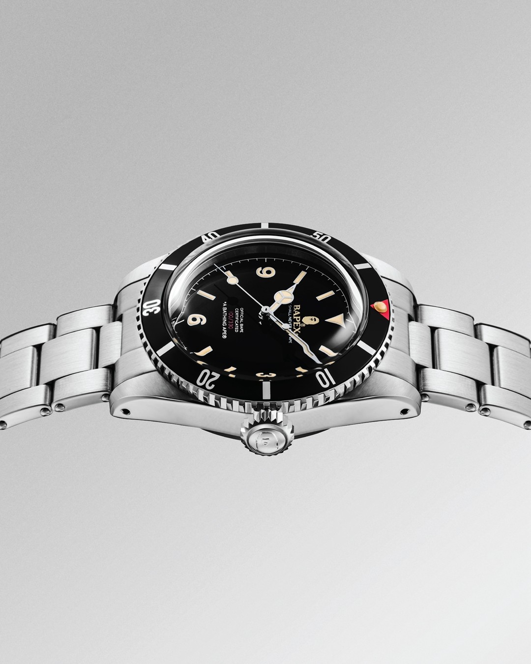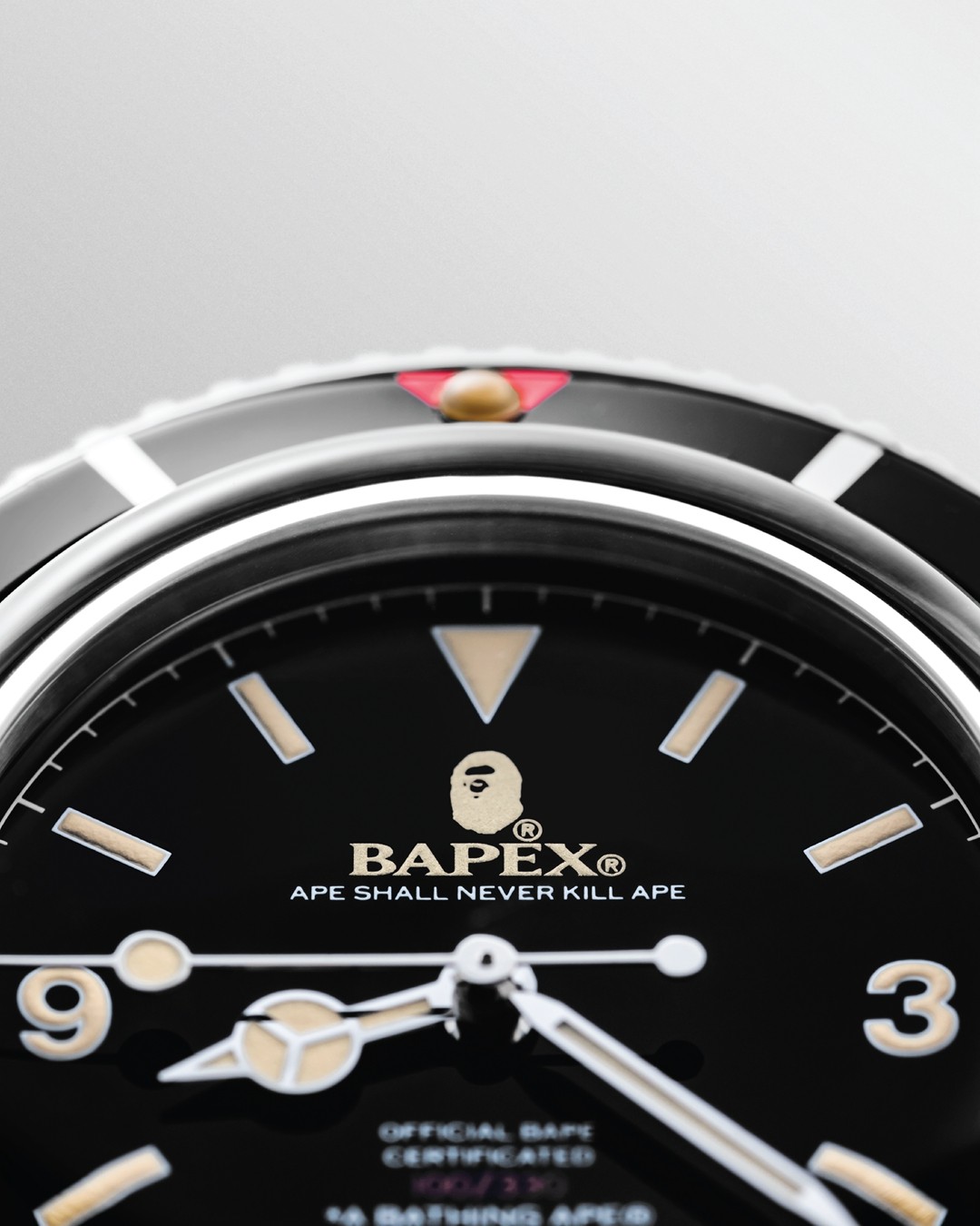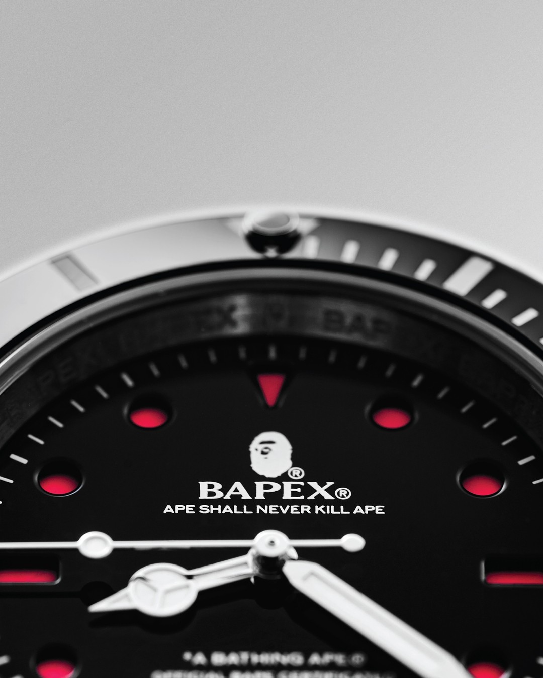 其次全新的 CLASSIC TYPE 1 BAPEX® 在外侧旋转圈上融入了红色倒三角细节提升颜值,表盘上的 3、6、9 数字致敬了上世纪的初代潜水表。