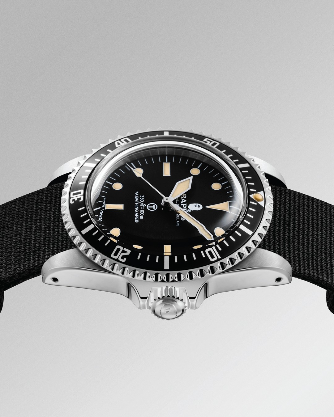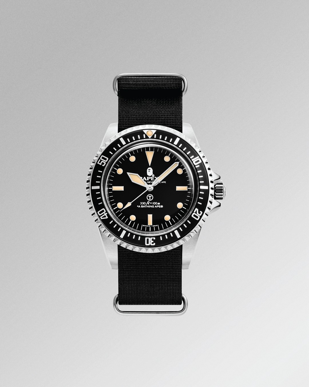 最后 CLASSIC TYPE 1 BAPEX® NATO 以军事规格潜水表为灵感,将传统时针改为军用潜水表的剑针,并加入上世纪夜光涂料的大 T 字样,造型十分硬朗,再配以军用 NATO 表带,堪称日常搭配的首选。