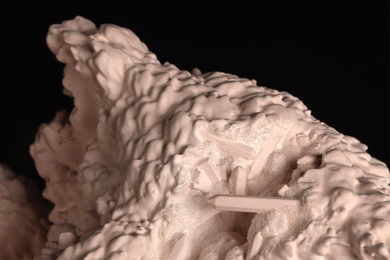 「被侵蚀的泰迪熊」灵感来源于 Daniel Arsham 在 2017 年所创作的粉色亚硒酸盐与蔷薇石英材质的泰迪熊作,艺术家将原作按比例缩小创作而成并由 Archive Editions 出品。