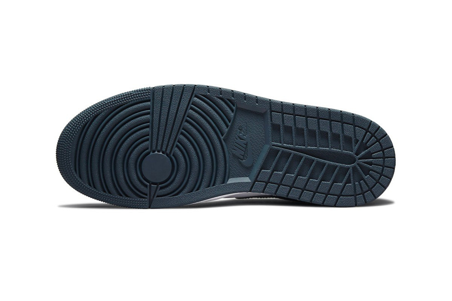 整双鞋设计沿袭 Air Jordan 1 Low 经典轮廓,采用白色光滑皮革覆盖,鞋身框架辅以深青色,营造出鲜明的视觉感受。