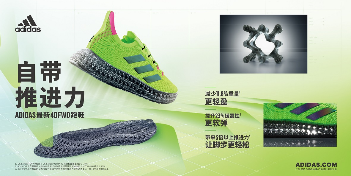 相较于此前的 4D 中底产品,全新 4DFWD 中底在鞋跟的动态抗疲劳测试中测得的向前推进力是 adidas 上一代 4D 中底的 3 倍。
