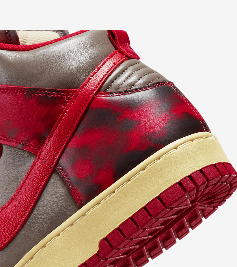 鞋侧荔枝纹皮革红色的 Swoosh 呼应鞋款配色,与红色内衬呼应,使整体层次十分丰富。