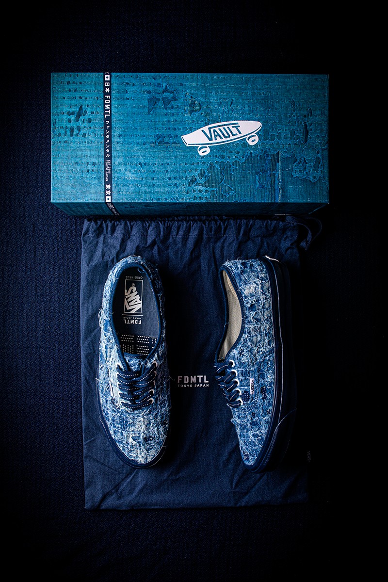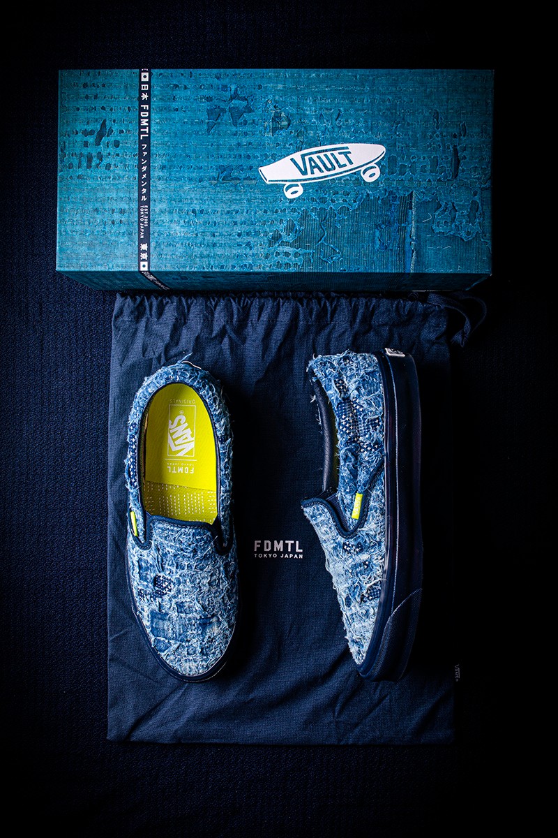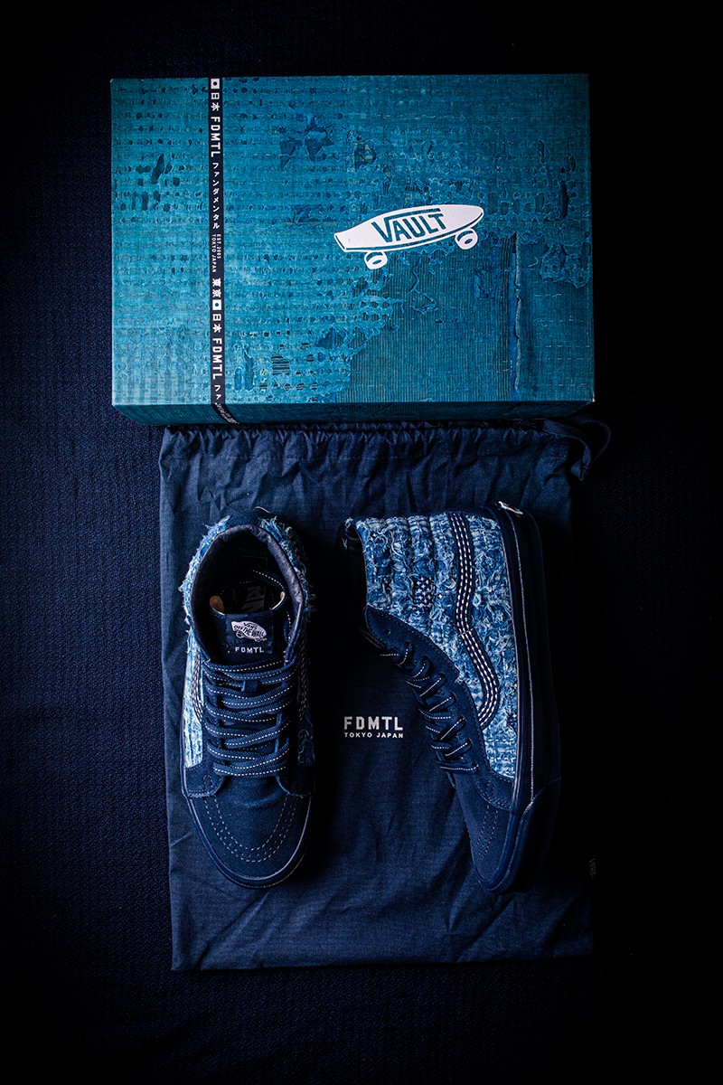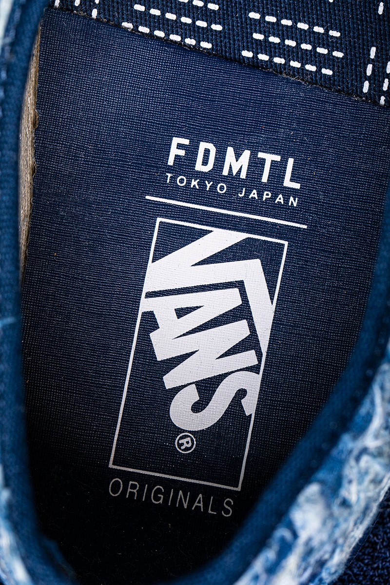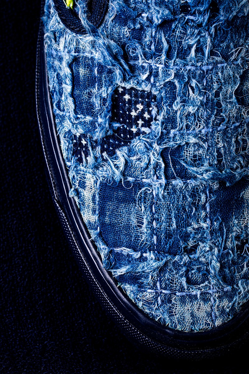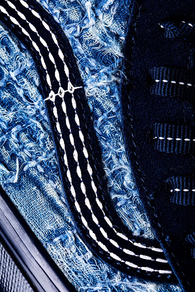 鞋面整体采用重度做旧的蓝染丹宁面料,加以褴褛拼布、刺子绣技艺建构,散发出浓郁的 FDMTL 品牌特色!