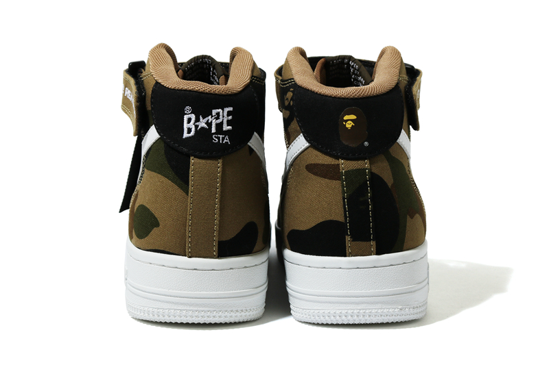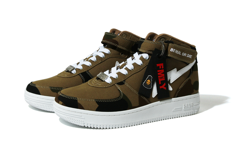 联名鞋款 BAPE STATM mid 以经典 1st camo 为主要灵感,脚踝魔术贴带印有 Jessie Reyez 的座右铭「BE REAL OR DIE」。