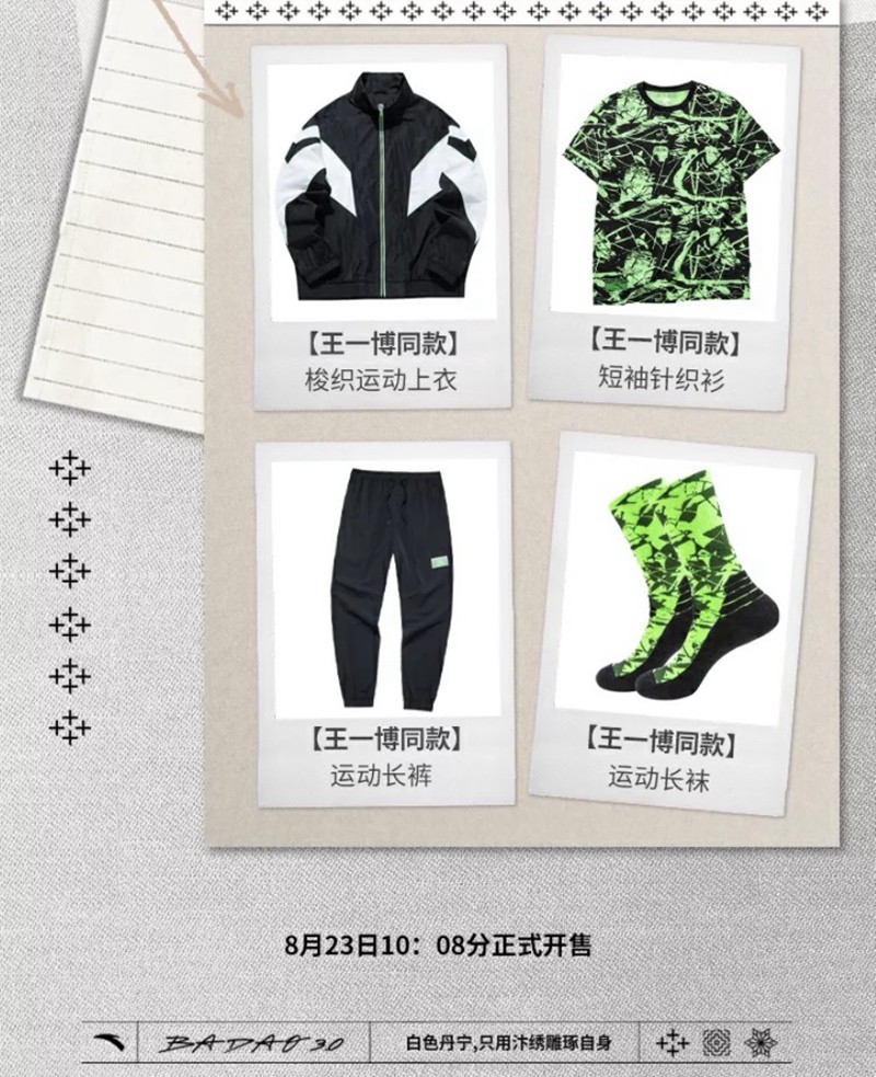 今天,安踏再次释出王一博亲自上脚图,并且宣布还有配套服饰一同推出!
