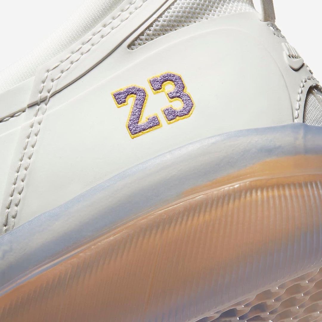 侧身处 Swoosh Logo 采用紫色呈现,后跟位置点缀紫金色 23 字体,彰显詹姆斯球队身份。