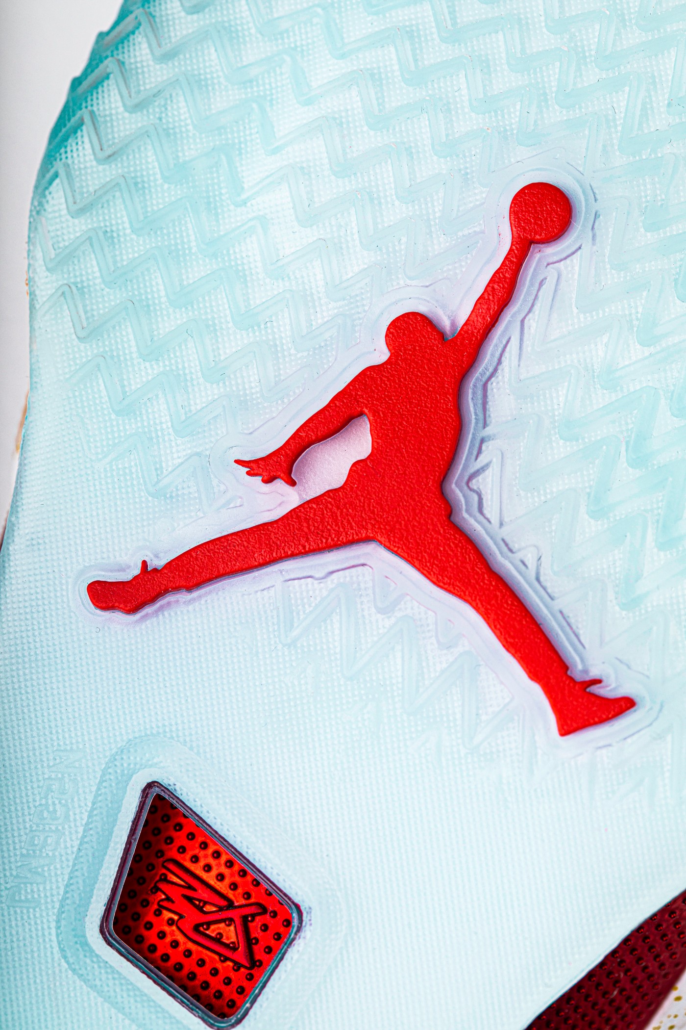 外底微微倾斜的 JUMPMAN LOGO,致敬了 Air Jordan 6 代的外底设计。而不规则的四面形镂空,则致敬了 Air Jordan 6 鞋舌处的镂空设计。