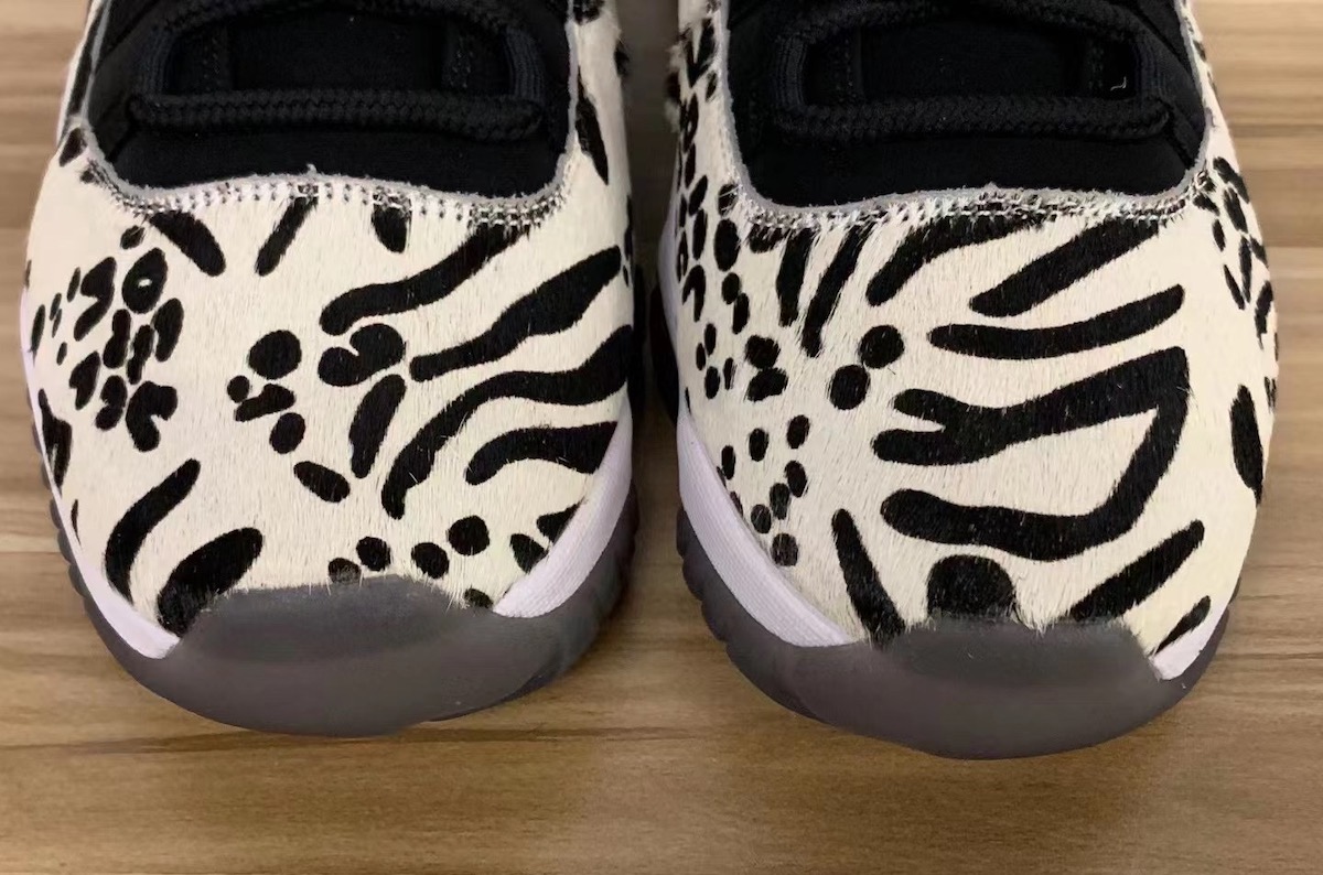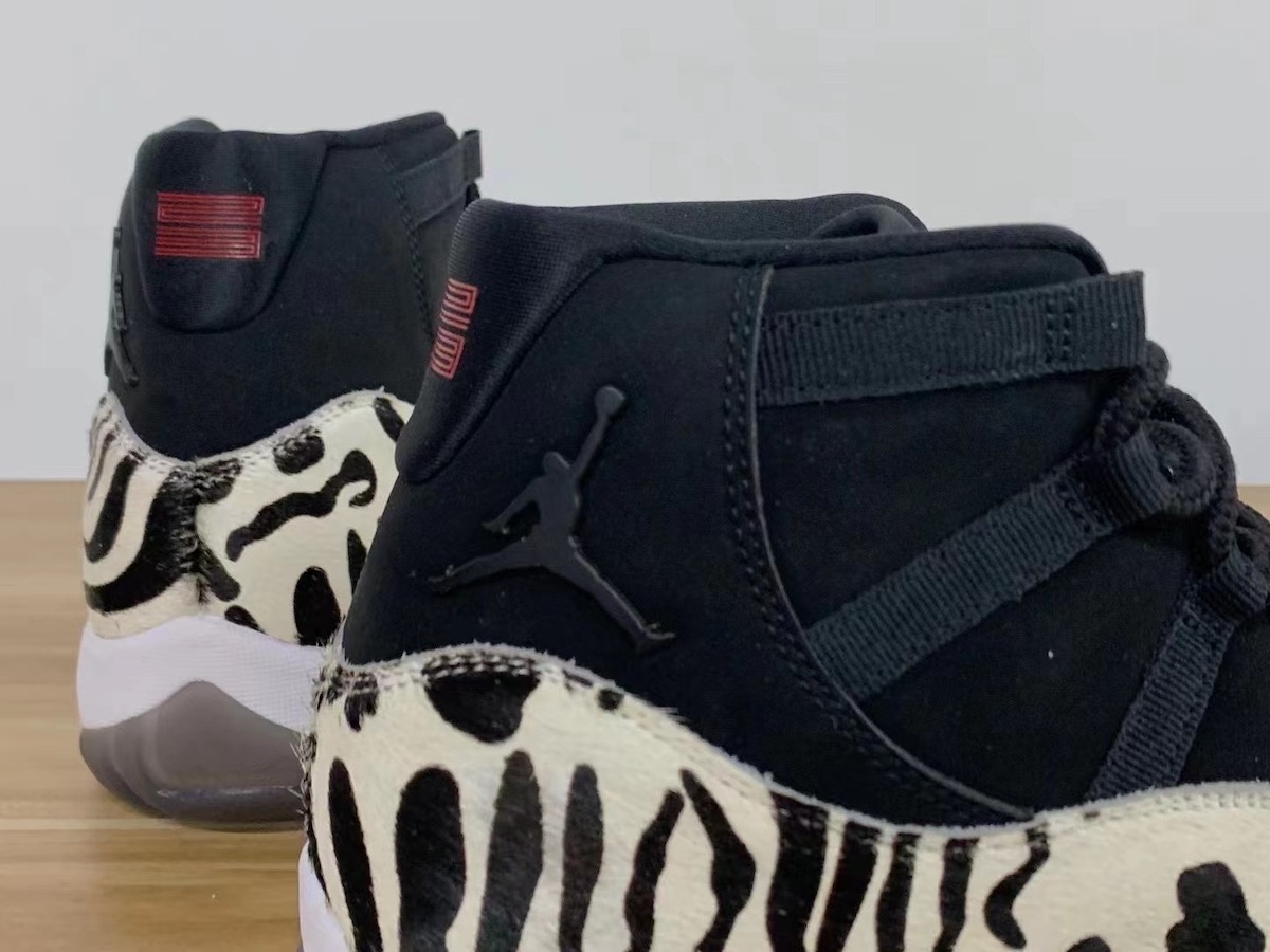 这双 Air Jordan 11 从材质上就非常特别,动物园配色传统的人造马毛鞋面替代了漆皮,黑白色的纹理像是将豹纹与斑马纹等多种元素合为一体。