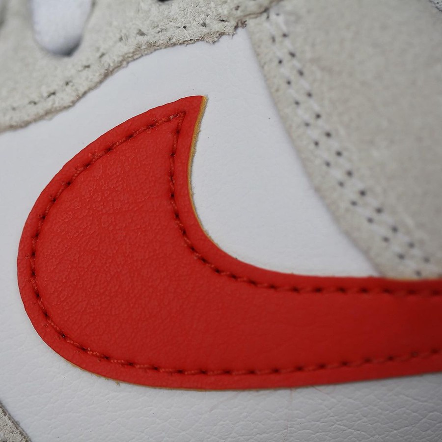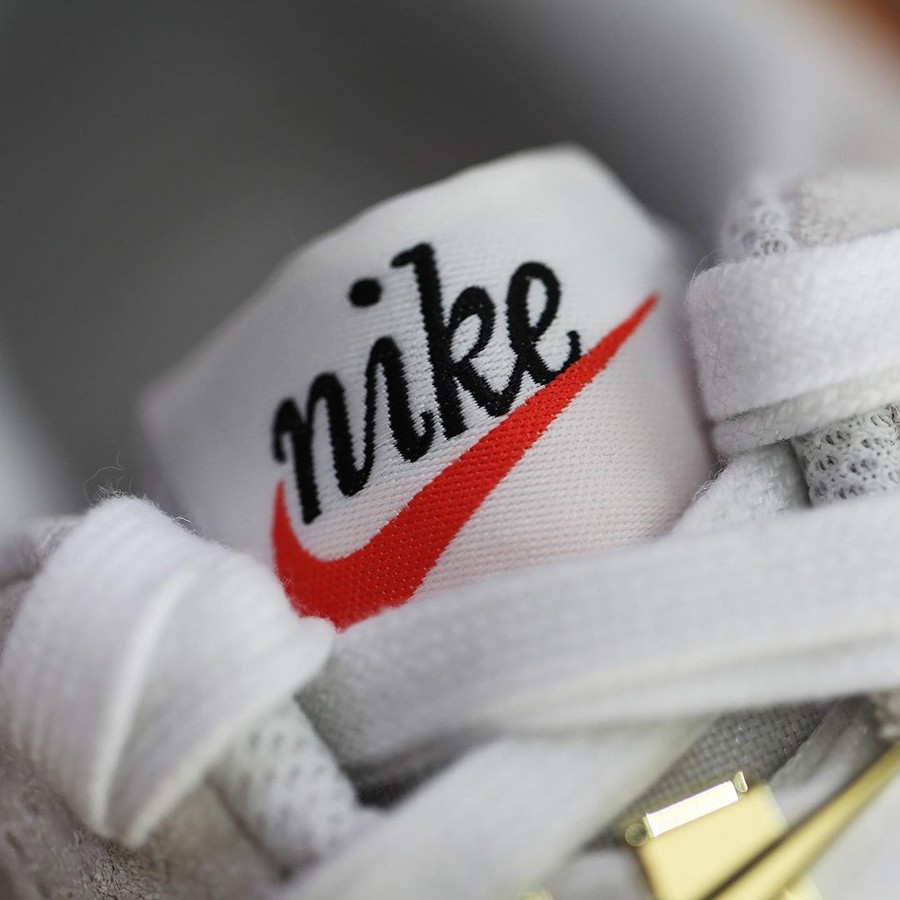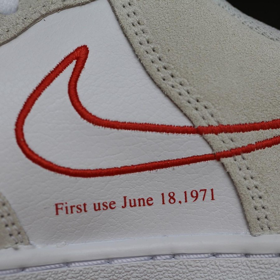 鞋身两侧分别采用皮质、刺绣 Swoosh Logo 并缀以「First use June 18,1971」字样,代表最初 Swoosh 鞋款的发售日期,格外有纪念意义。
