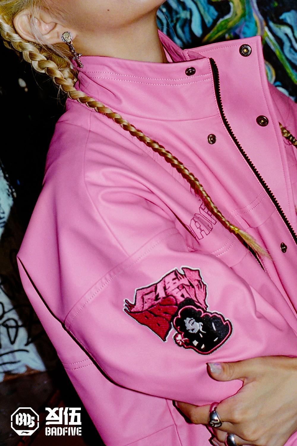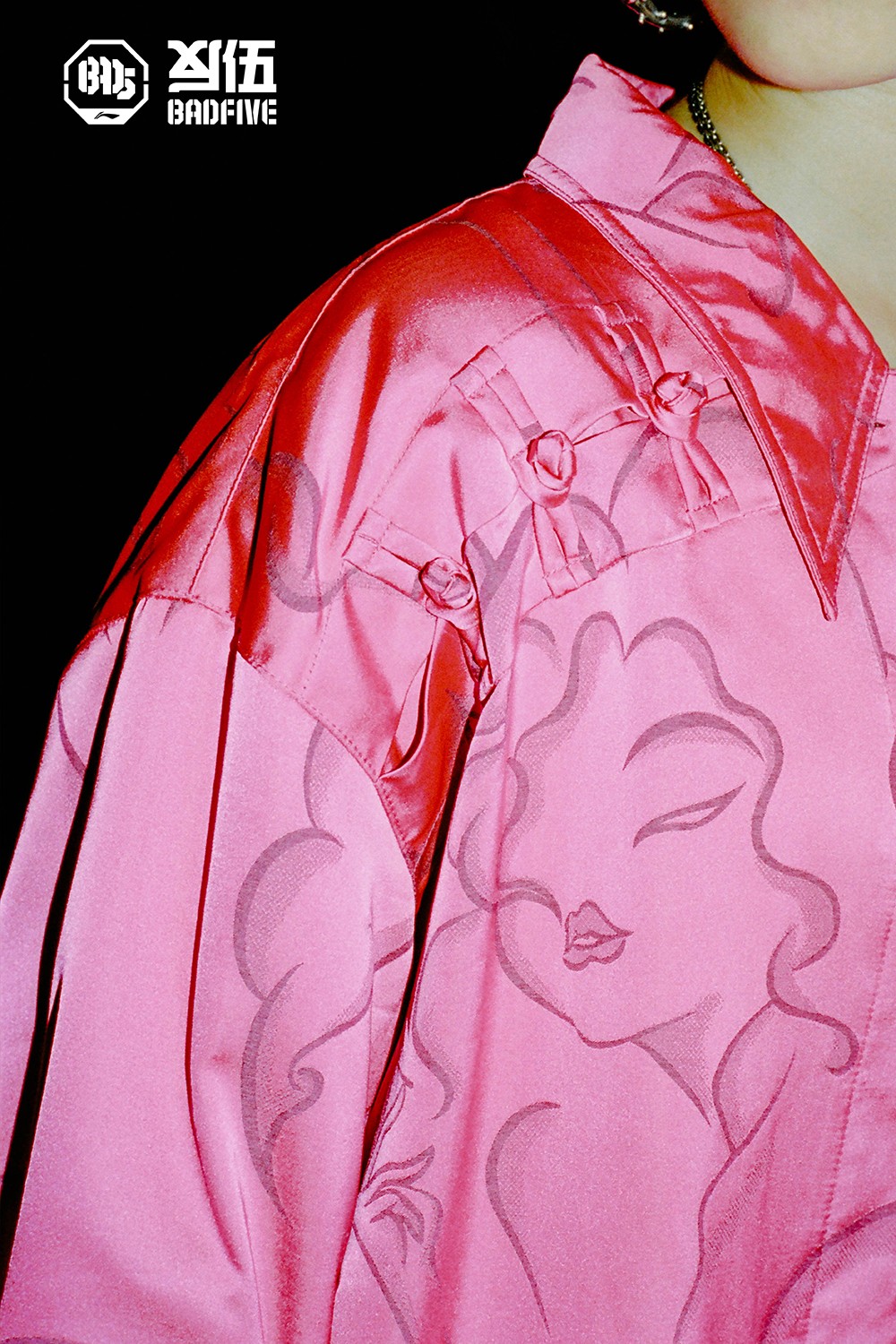 可以看出此次全新系列主打黑粉色调,鲜明的色彩表达结合独特旗袍斜襟、小立领、盘扣设计,运用提花缎面彰显独特街头韵味。