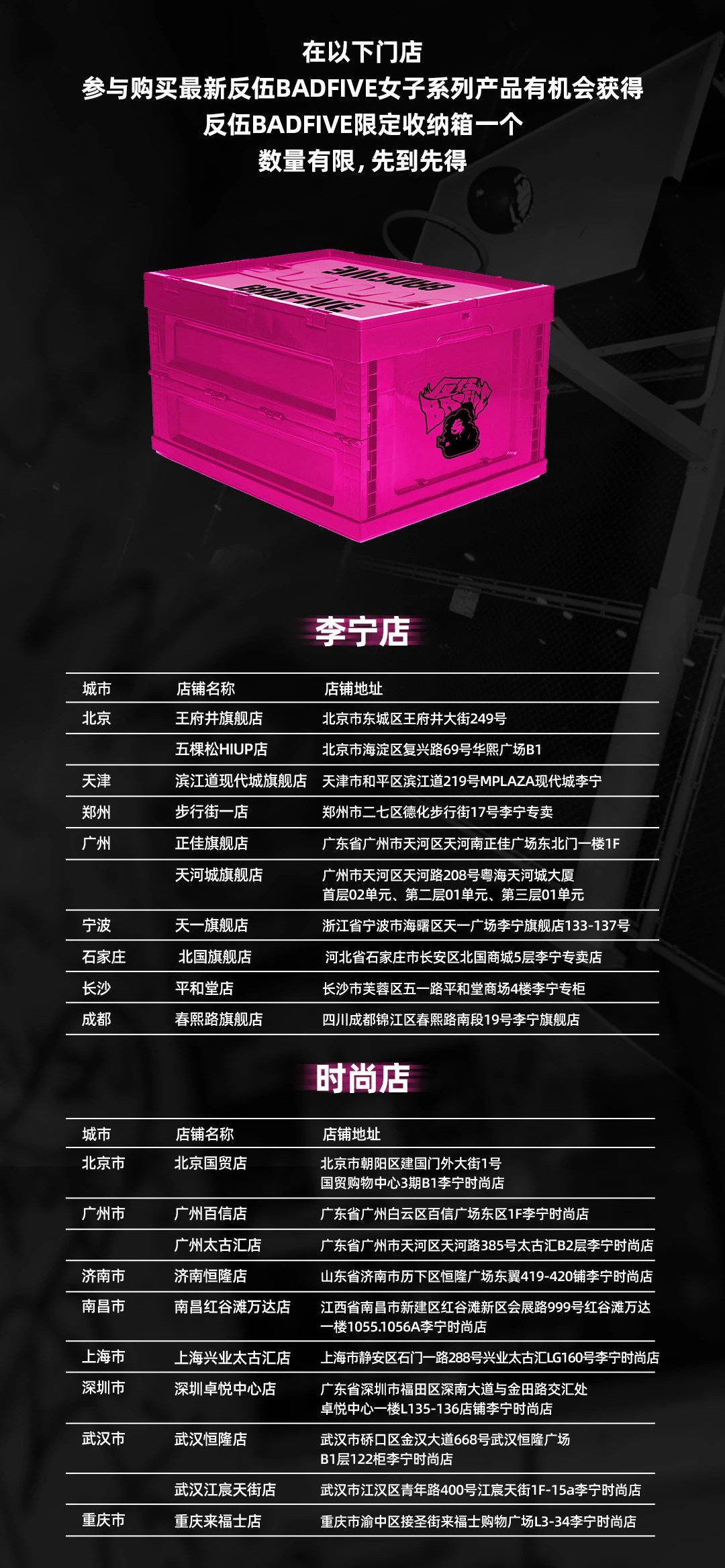 值得注意的是,前往以下指定店铺入手,还有机会获得反伍 BADFIVE 限定收纳箱一个。