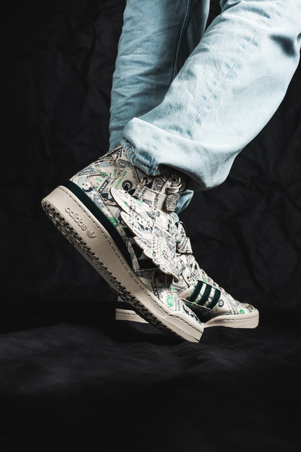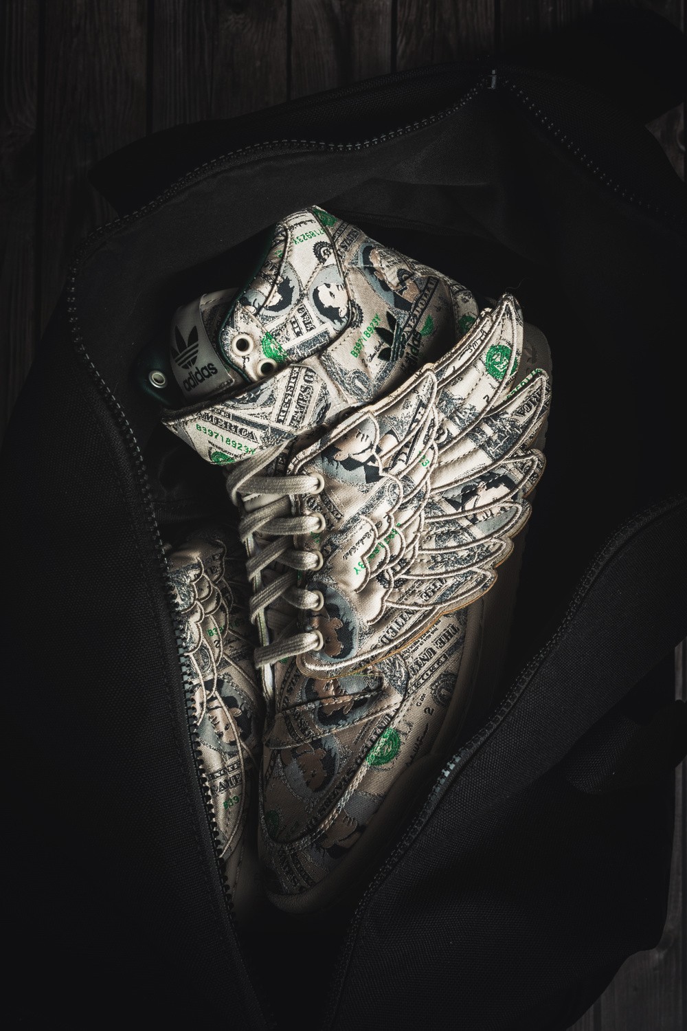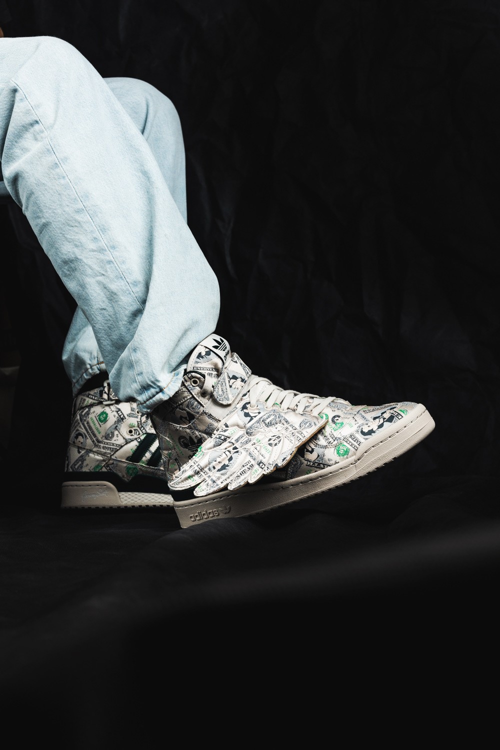鞋身侧面有可拆卸的翅膀部件,Jeremy Scott 个人风格尽显,鞋身通体布满 100 美元钞票图案。