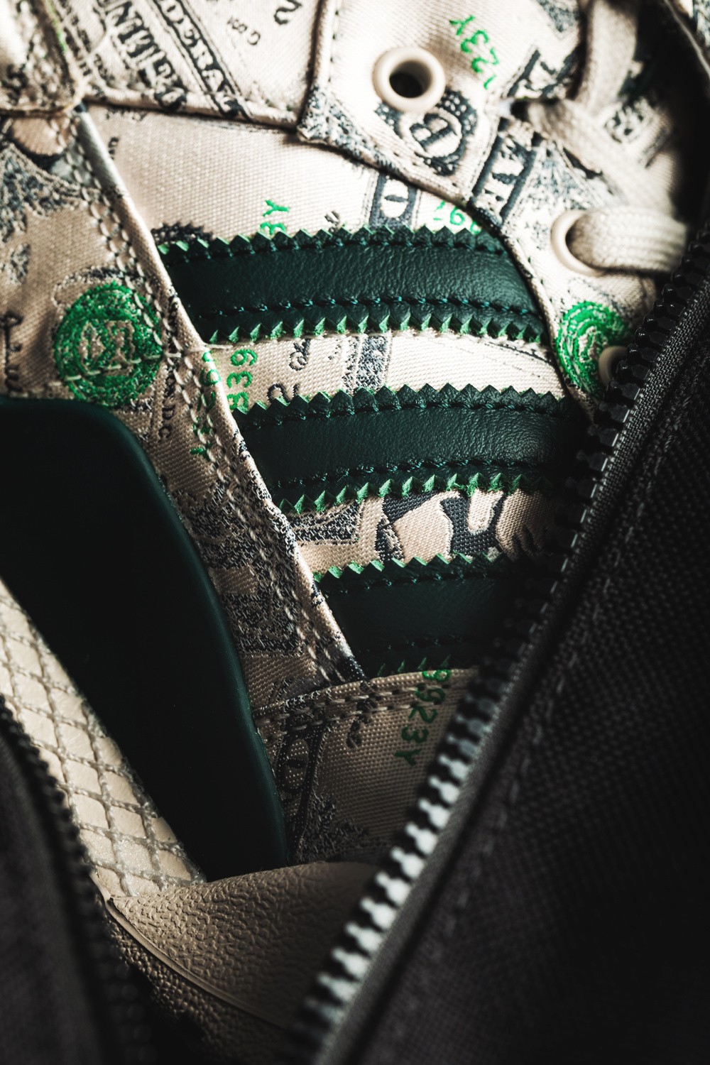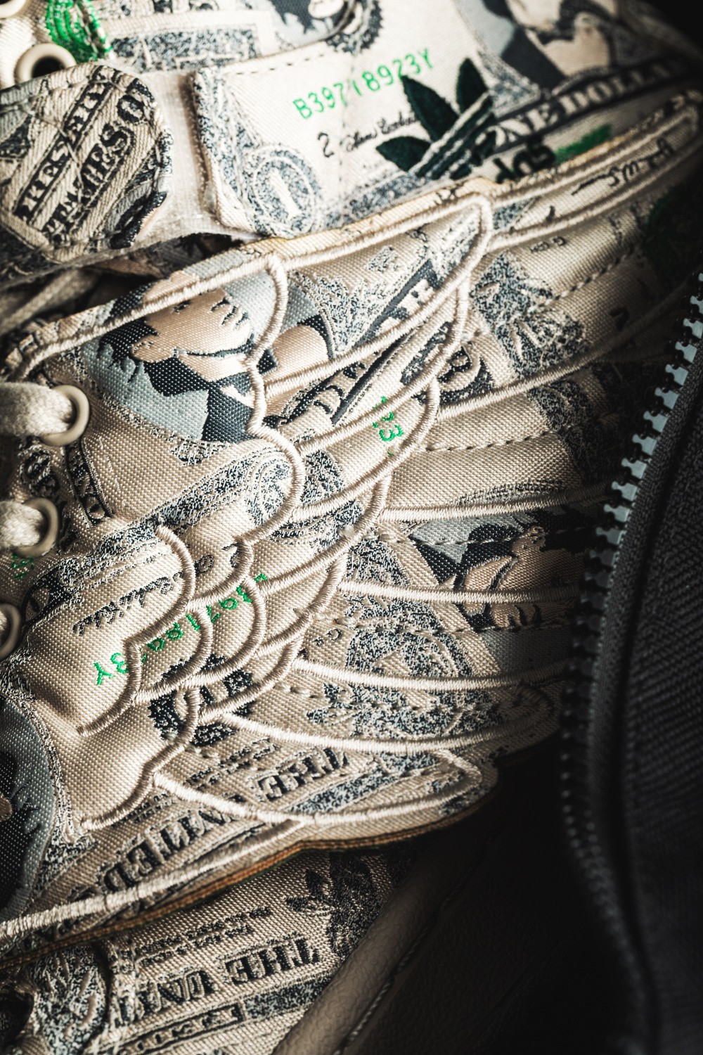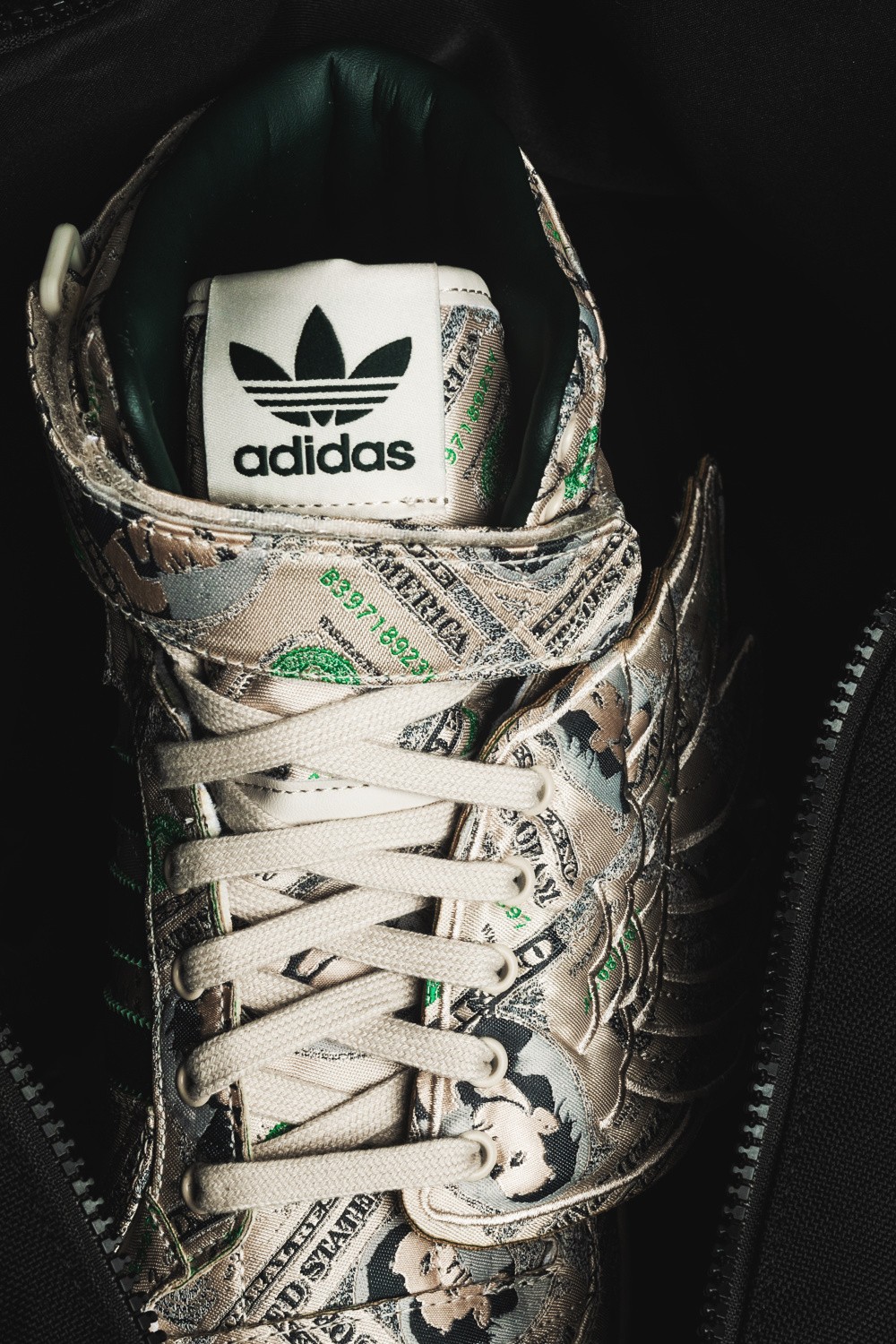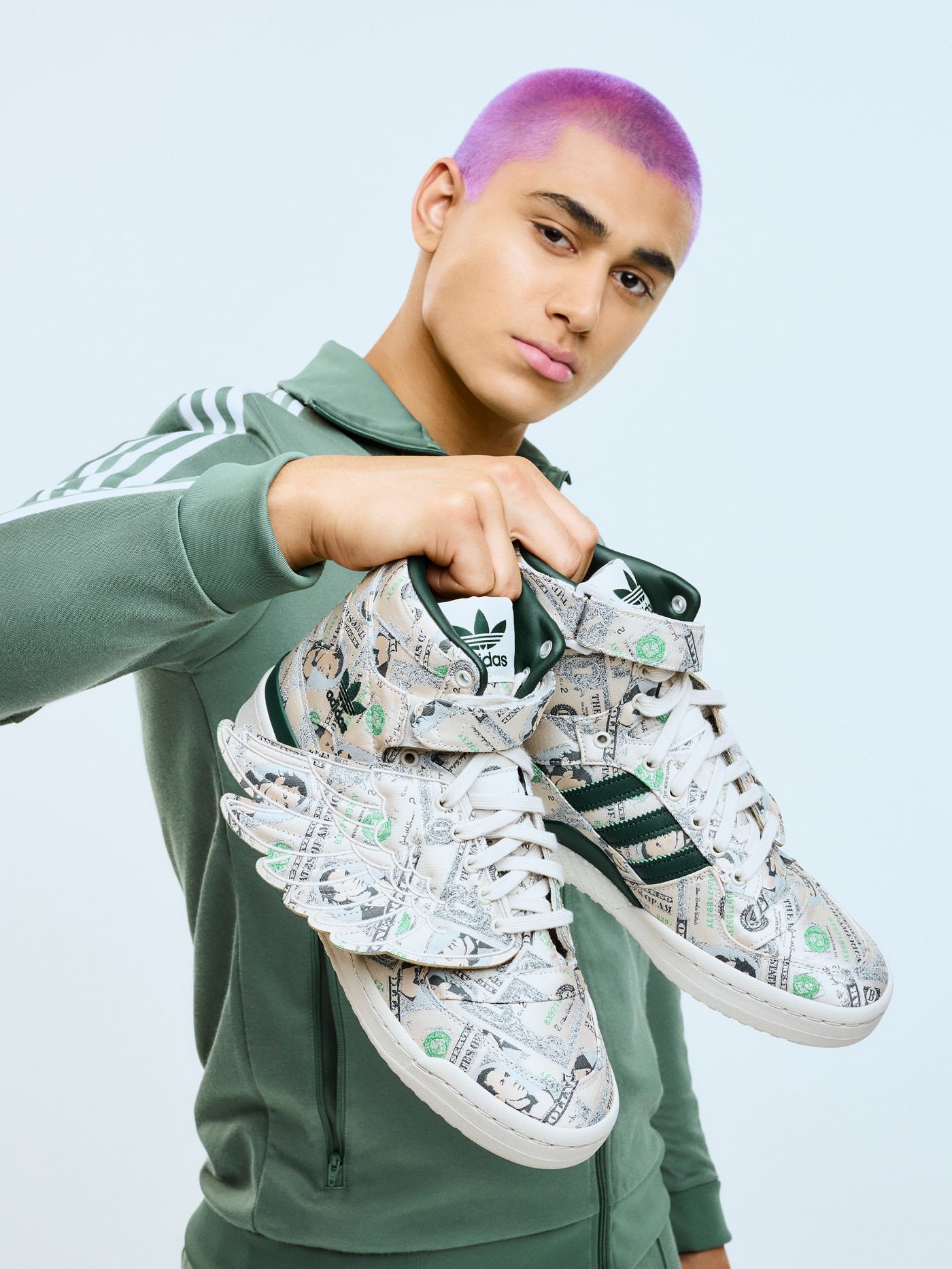 鞋身侧面有可拆卸的翅膀部件,Jeremy Scott 个人风格尽显,鞋身通体布满 100 美元钞票图案。