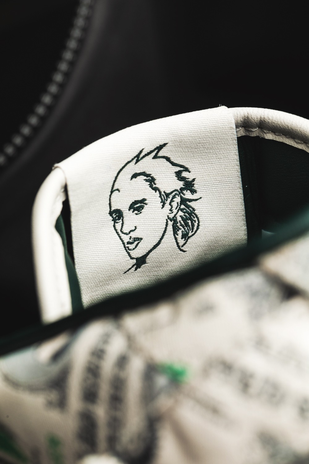 有趣的是,鞋面的美金上并非本杰明·富兰克林的头像,而是换成了 Jeremy Scott 自己的头像,尽显 Jeremy Scott 的恶搞天赋。