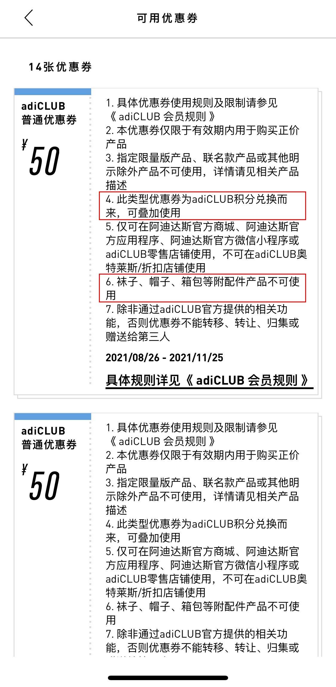不过优惠券也有一些限制,“袜子、帽子箱包等附配件产品不可使用”。
