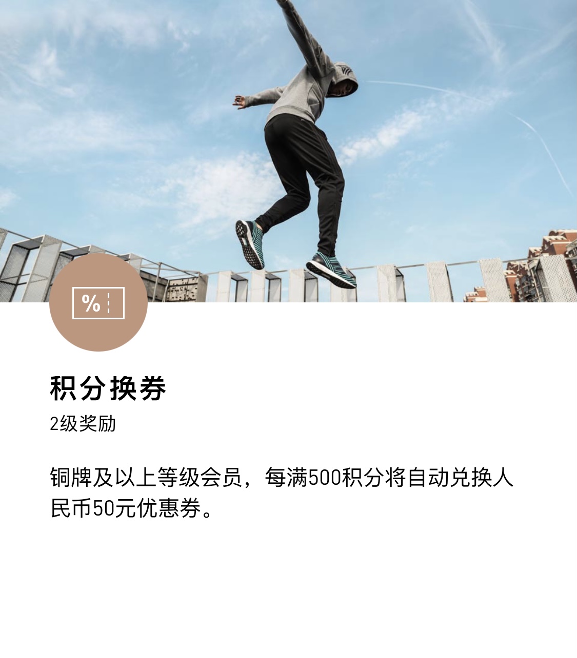 这个优惠卷是 adidas 推出的「积分换券」活动,铜牌及以上等级会员,每满 500 积分将自动兑换人民币 50 元优惠券。