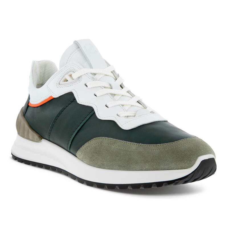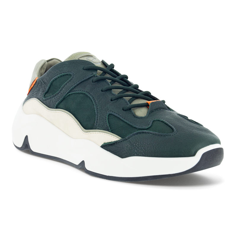 鞋面皮革均采用 ECCO 工厂自主生产的全粒面牛皮鞋面,并使用运动感十足的波浪线条呈现。