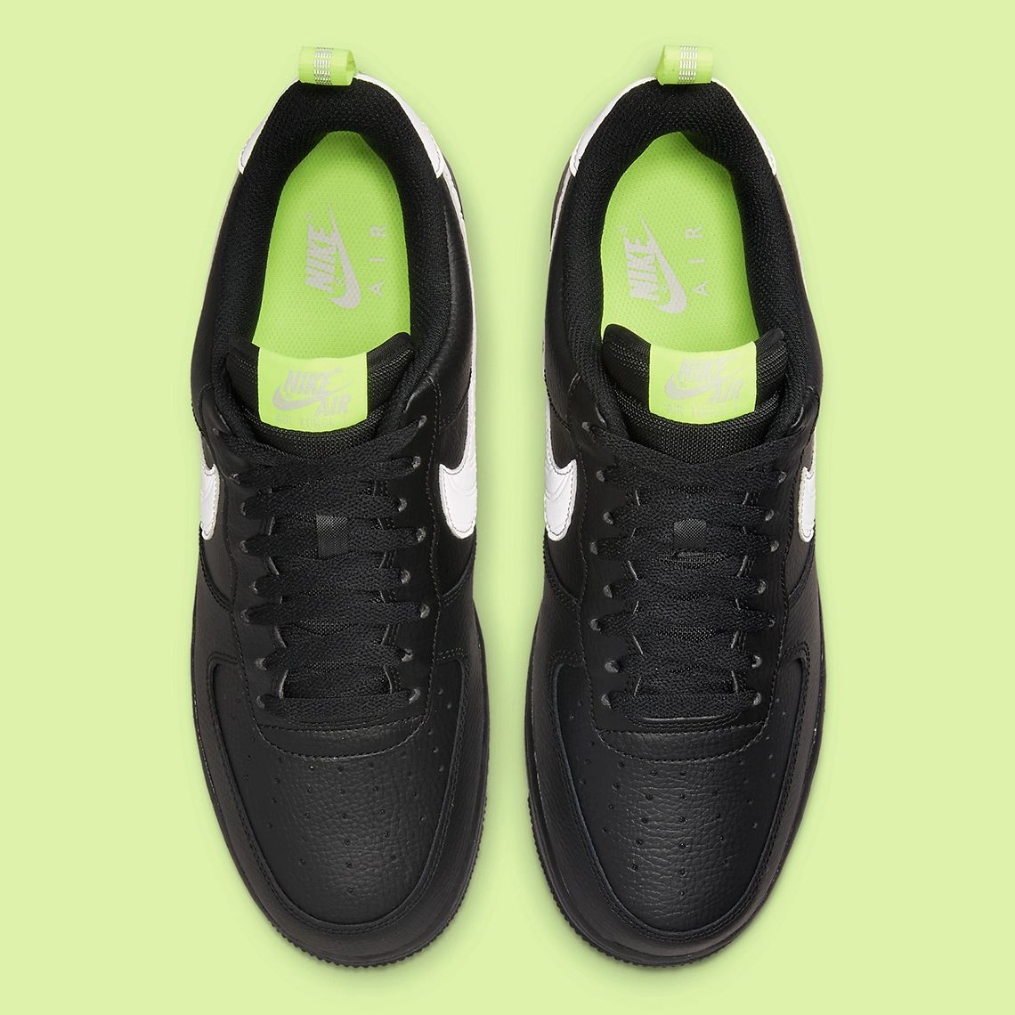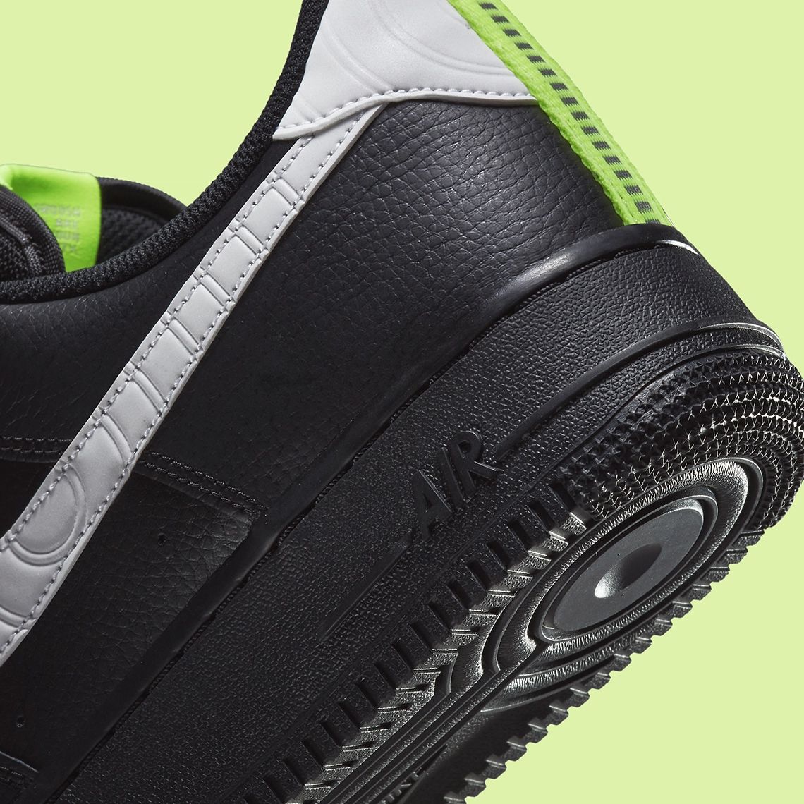 鞋舌标签以及后跟拉环以荧光绿色示人,为深色的鞋身增加一抹亮色。