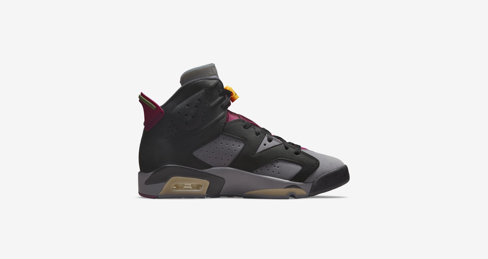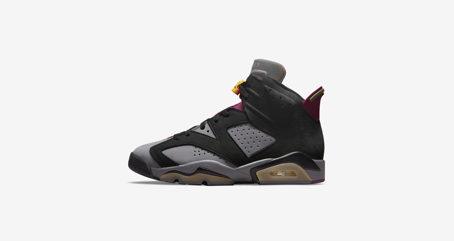 整双鞋采用了黑灰双色拼接,鞋舌、内靴和外底以酒红色点缀,呈现出 Air Jordan 7 波尔多红酒配色。