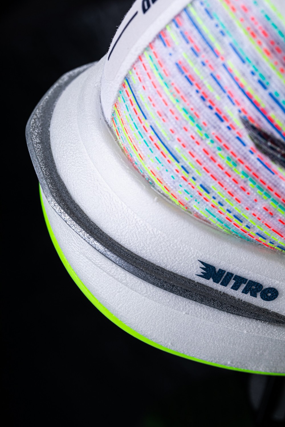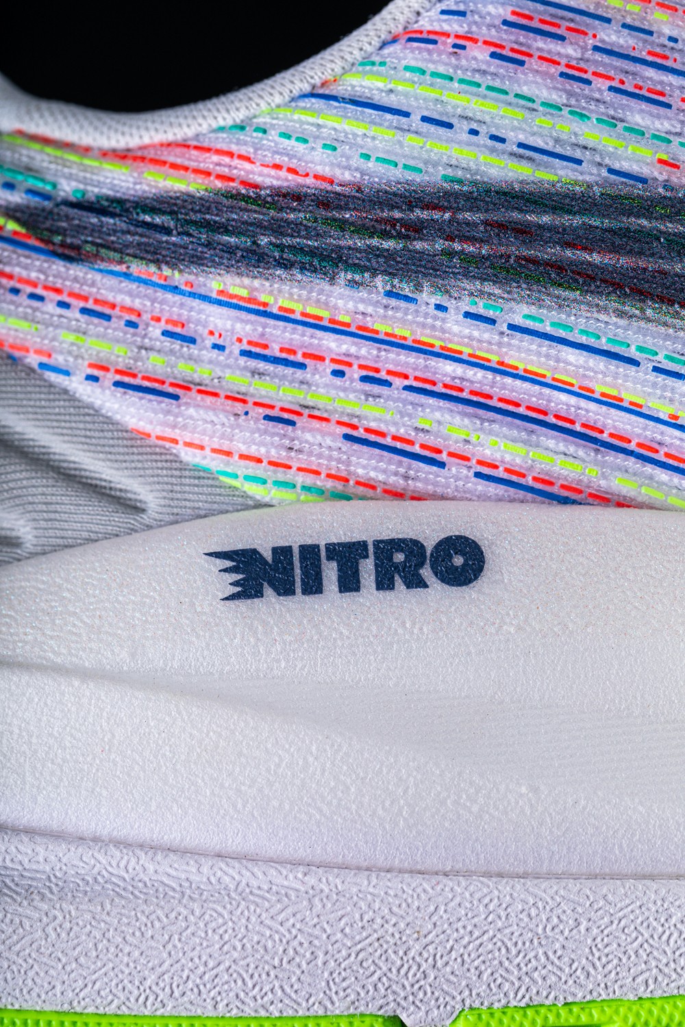 NITRO 氮气缓震技术中底由高品质原材料制成,将液氮注入胚模中使其发泡延展,创造出轻量与高缓冲回弹特性。