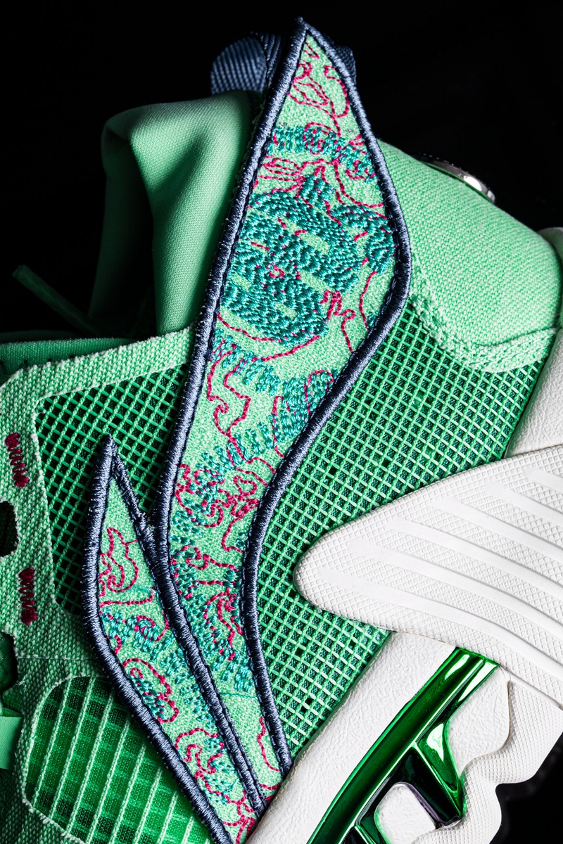 鞋侧 Logo 表面采用电绣处理,灵感来源于苗族传统服饰图案。
