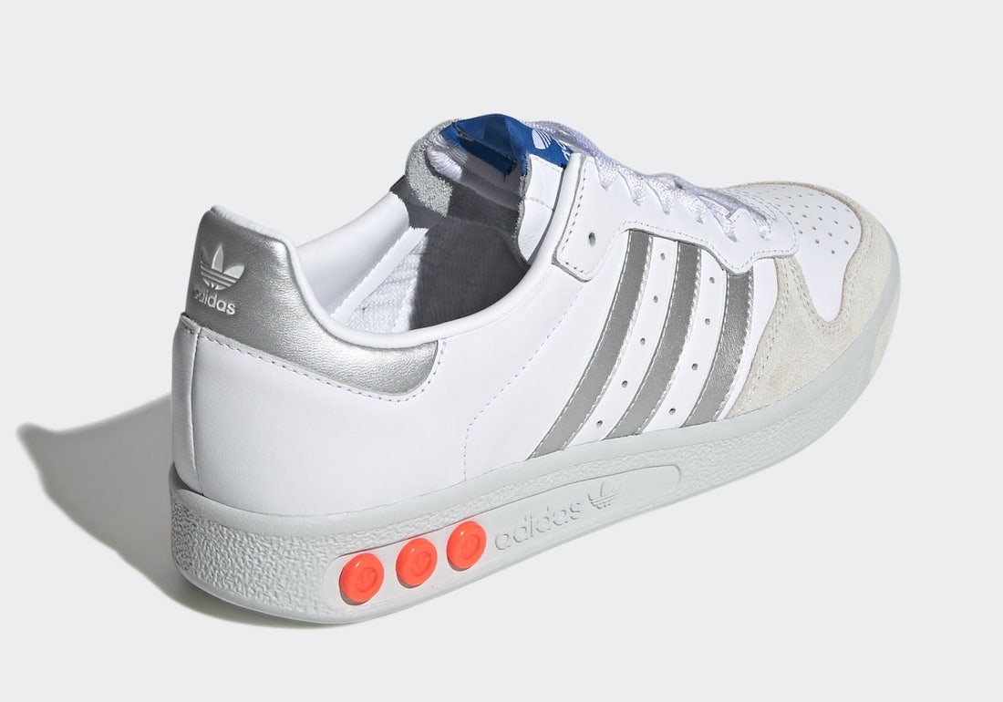 鞋侧银色 “三道杠” Logo 与后跟采用银色反光材质,吸睛度十足。