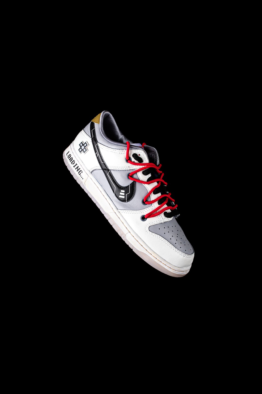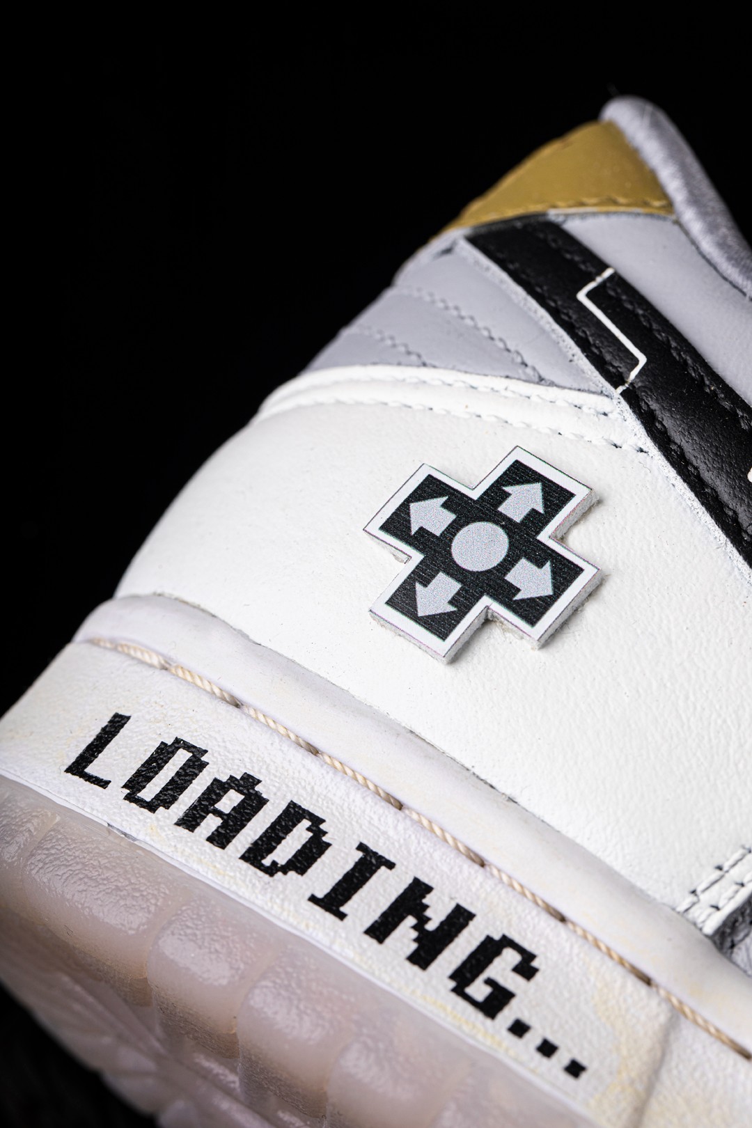 细节处添加黑色电子元件般的纹理,并在后跟处添加了方向键创意拼贴和「LOADING...」字样,为鞋身增添了趣味性。
