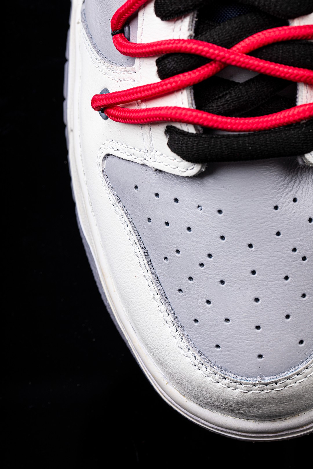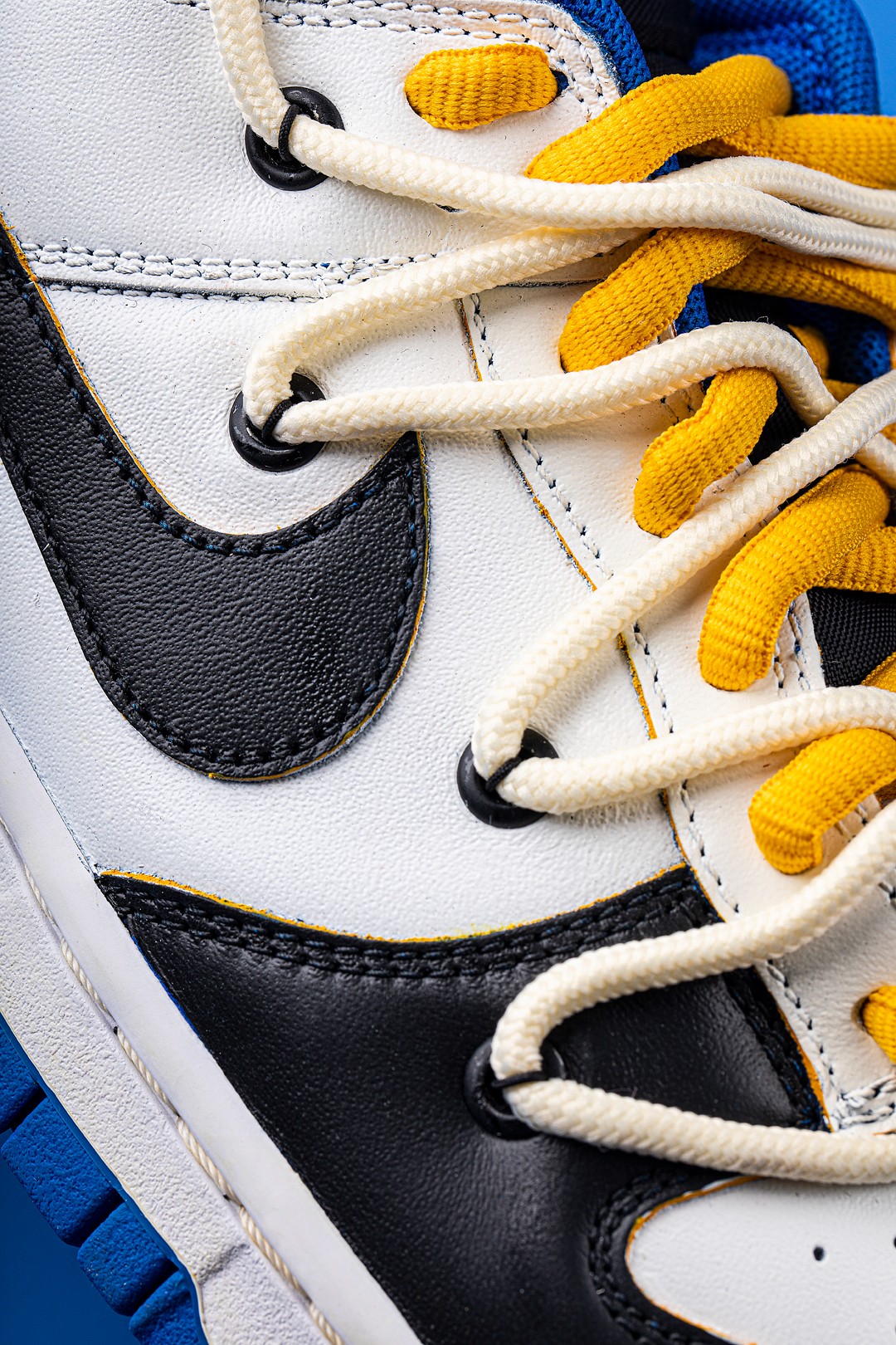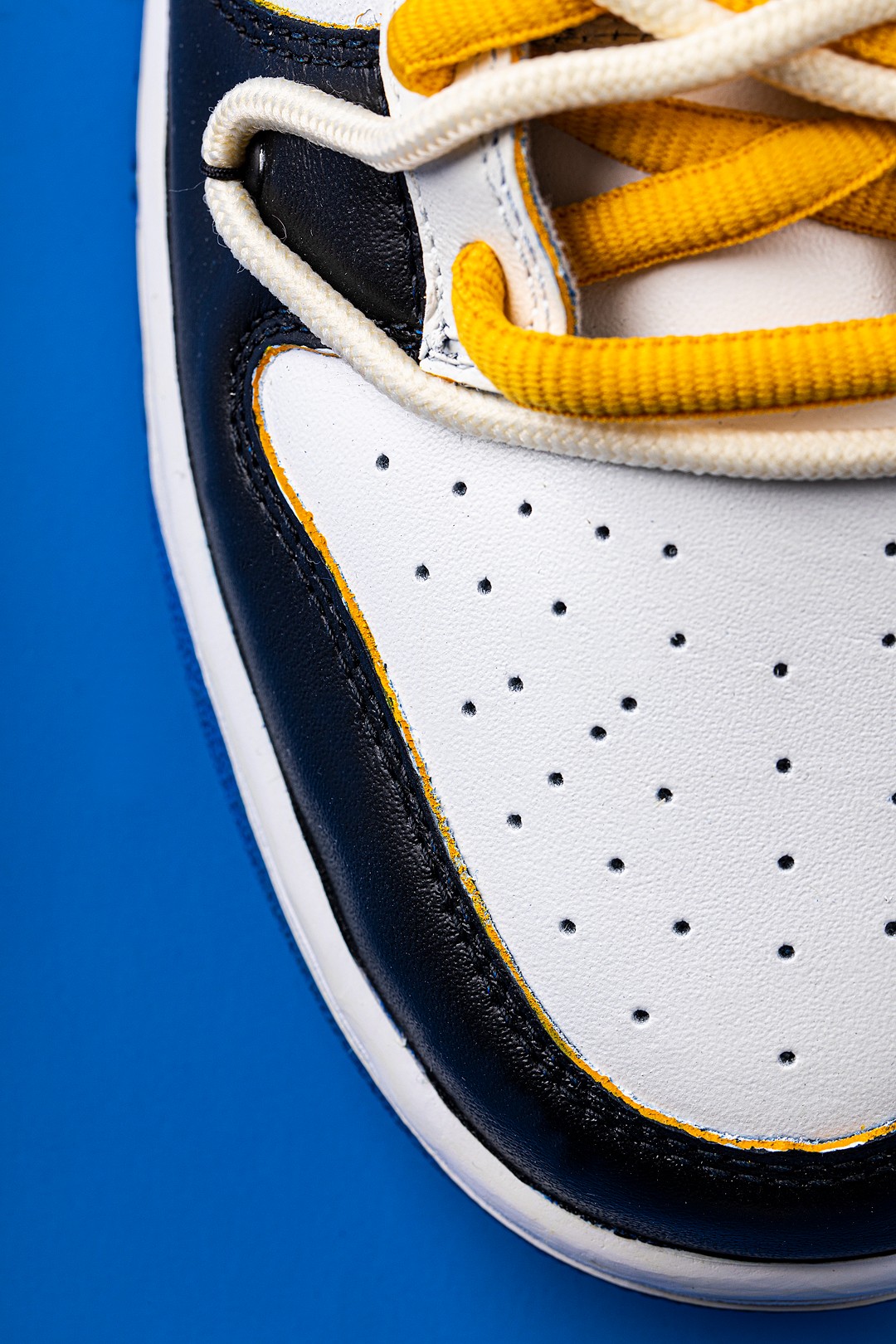 最后一双采用黑白蓝三种颜色打造,与我们的老熟人「藤原浩」可谓是师出同门,鞋头处的黑色细节包裹白色鞋面,呈现出黑脚趾造型,很难不让人联想到 fragment x Air Jordan 1。
