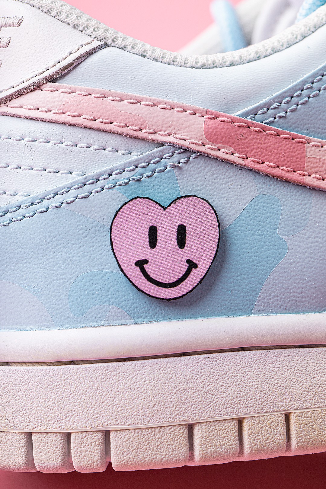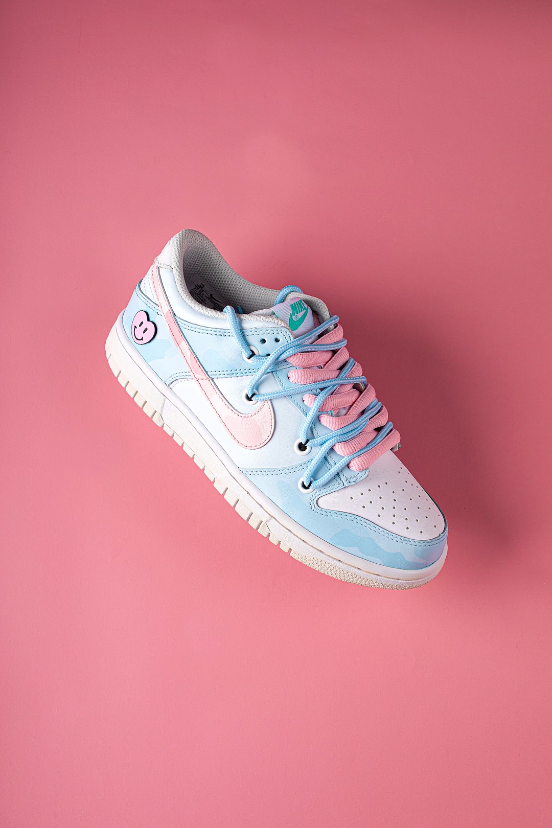 后跟与上一款配色相似,同样带有切合主题的贴片设计,此次选择了面带笑容的爱心图案,进一步烘托出鞋款的甜美造型。