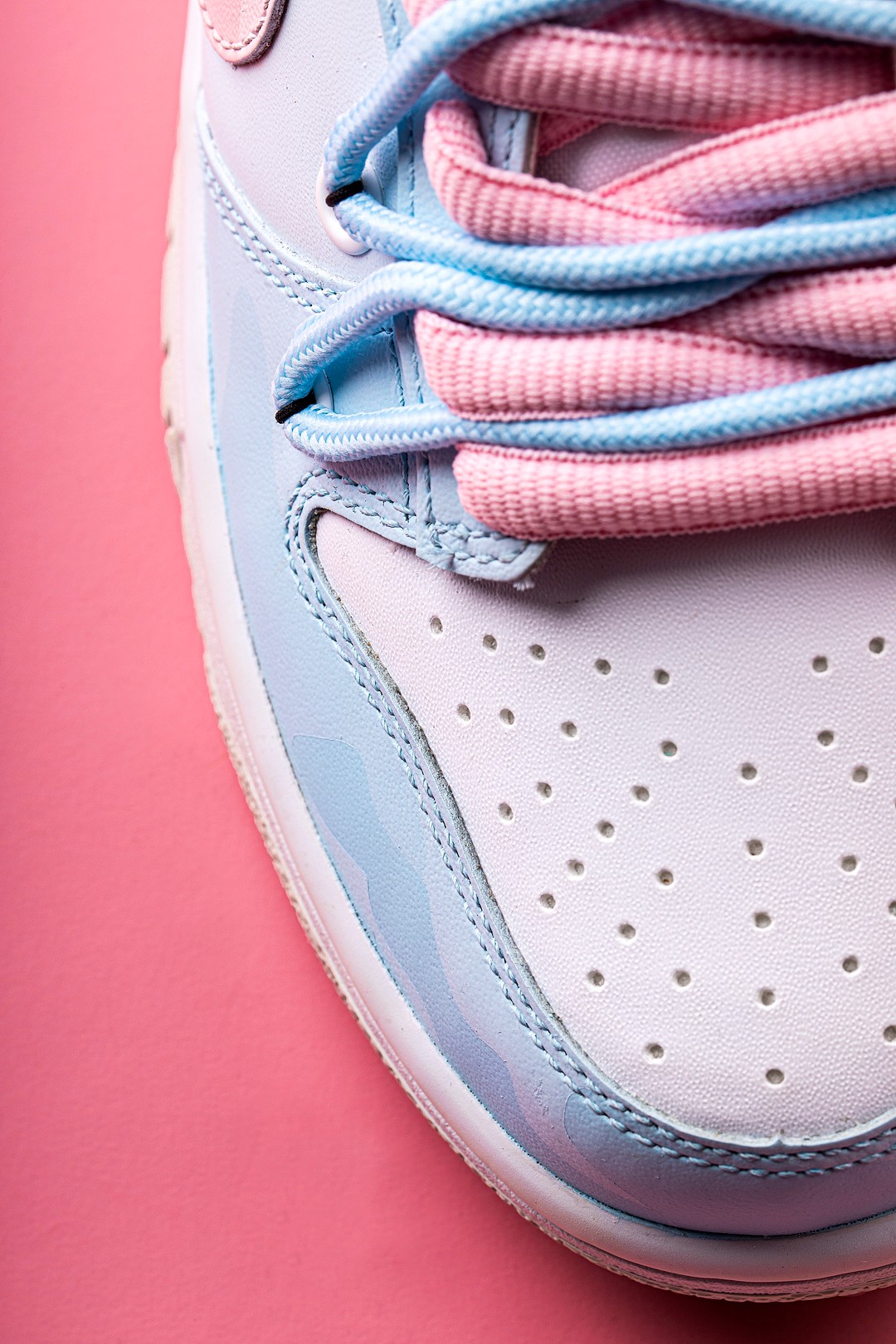 第二款配色被称之为 “独角兽” 造型鞋如其名都相当甜美,低饱和度的蓝色与粉色营造出让人难以拒绝的恋爱气息,再加上皮革材质的鞋面,绝对可以称之为「少女杀手」。